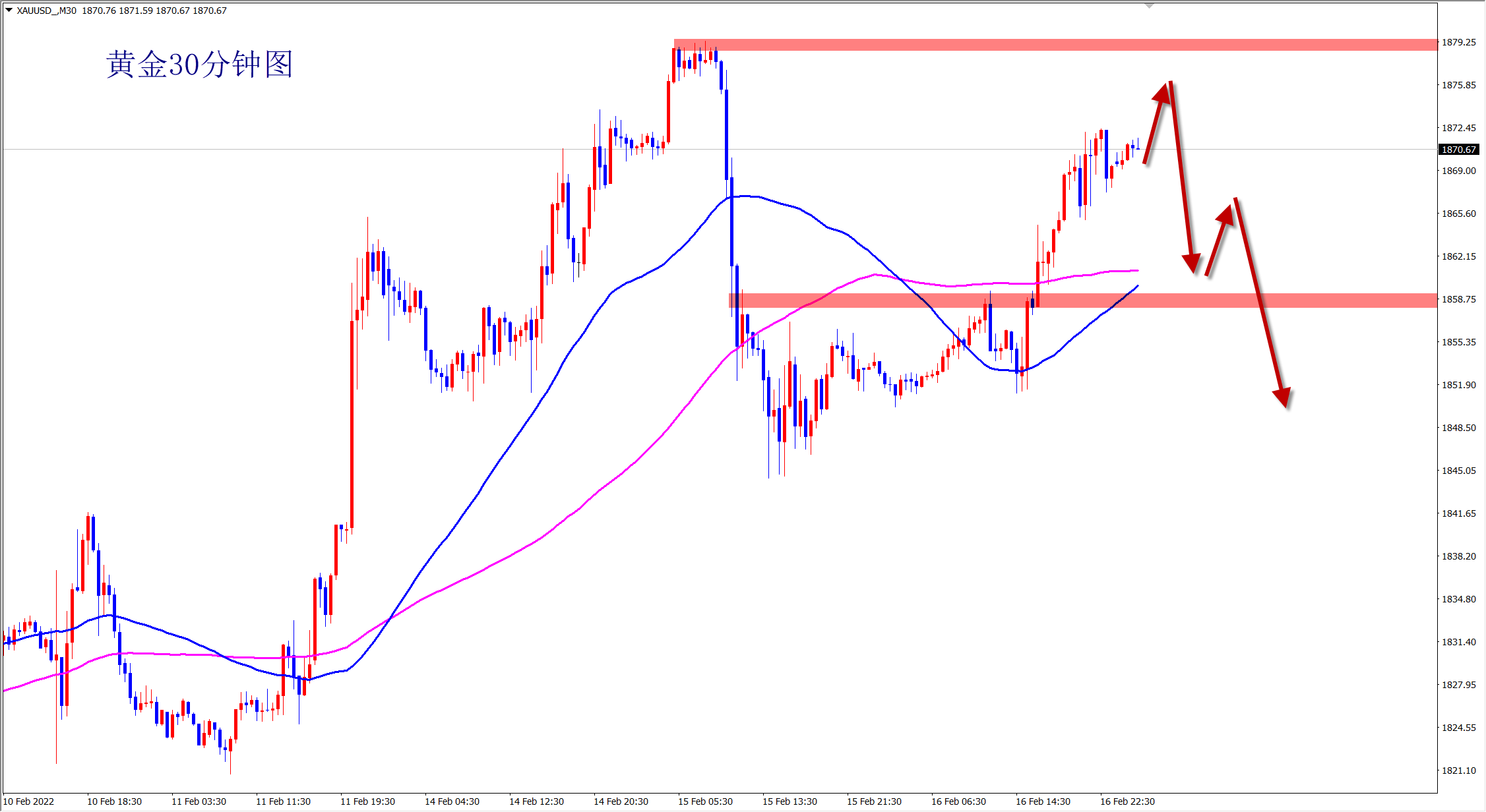 黄金当前高位震荡,前高1878压力不突破,无法开启新的上涨,操作上不要轻易的追涨杀跌,今日守1878的高点压力干空! 黄金此前受到避险情绪的退潮,高位杀跌,在1843位置获得支撑后反弹,但是本次反弹无法突破新高,只能是上涨过程中的二次探顶过程,一旦失败,双顶结构形成,必将会再次下跌! 黄金今日守高点压力