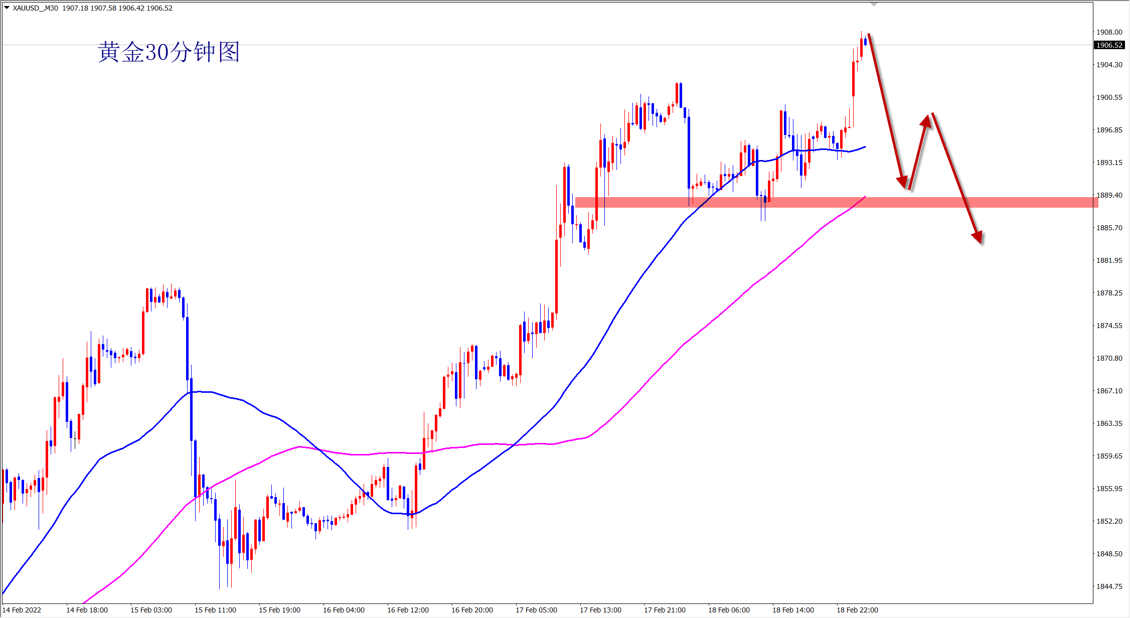 黄金早盘跳空高开,但是明显的不持续,而且消息上显示普京将和拜登在法国会晤,而且前提条件就是俄罗斯不入侵乌克兰!黄金避险情绪消退,今日早盘依托1910的压力干空! 黄金此前的上涨均是由于避险情绪的推动,而今日跳空高开而不延续,并且再次跌入到周五的盘整区域内,假突破诱多!所以今日一定是要先空看跌回调,