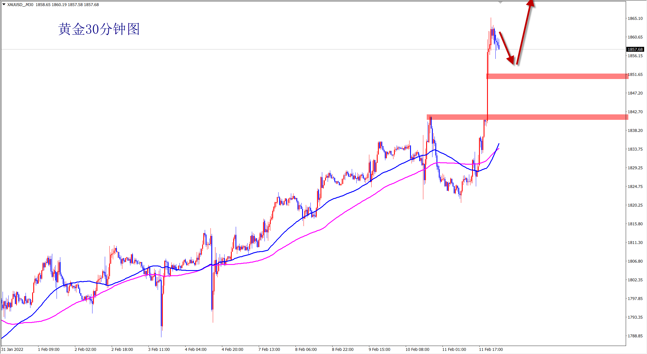有消息显示,俄罗斯的军队回程,乌克兰局势降温,黄金避险不再,多头退潮,空头反扑。黄金大跌,我们欧盘已经提示干空看跌,并且1872果断干空,如期暴跌止盈!爽! 当前黄金开启调整,如果跌破1850,则转为空头跌势,当前消息刺激下,黄金大跌,我们也要顺势操作,反弹还是继续先空!反弹靠近1870附近或者上方后