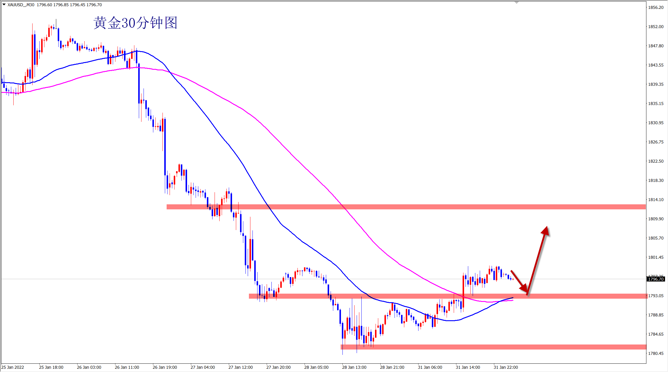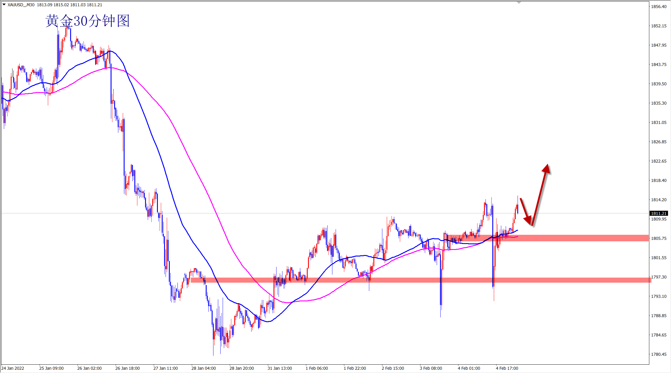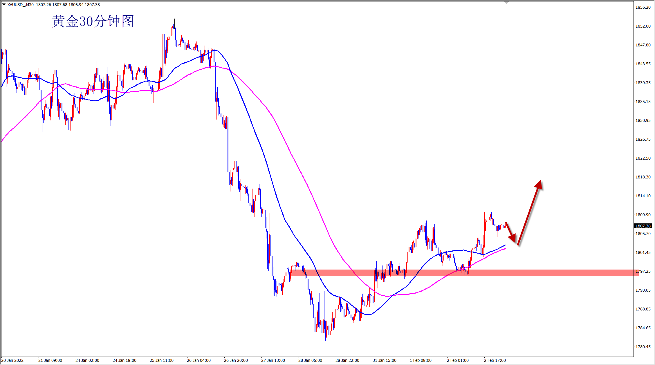 黄金上周五大非农利空后大跌,但是随后直接强势深V,今日受到周末避险消息的影响,直接大阳线拉起,多头强势!今日早盘顺势低多看涨,依托1805的支撑干多! 黄金当前处于反弹上涨走势,此前连续两次下跌都没有跌破1790的支撑,而且都是深V直接拉起的走势,说明下跌的力度有限,而且黄金受到乌克兰地缘局势的影响,避