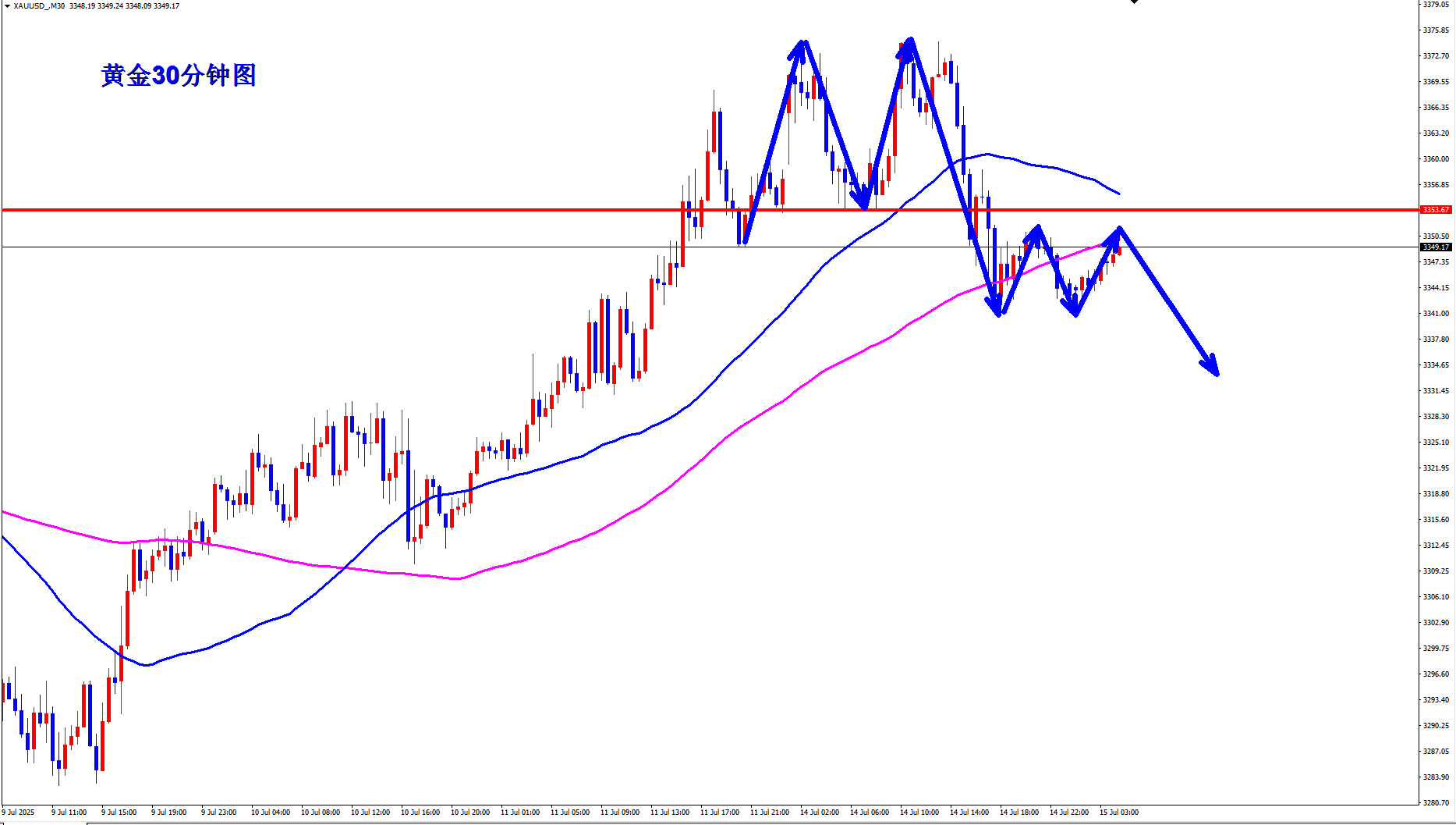 黄金昨天冲高回落,美盘更是反弹无力,最终黄金美盘延续下跌没有能够收上去,黄金短线多头反弹无力,已经开始转弱,可能还有下跌空间,早盘现价3350直接空。 黄金30分钟已经形成双重顶,而且昨天白天黄金3353两次获得支撑,不过晚上直接跌破3353,黄金多头却没有能够收复,那么黄金多头已经明显弱势,黄金30分