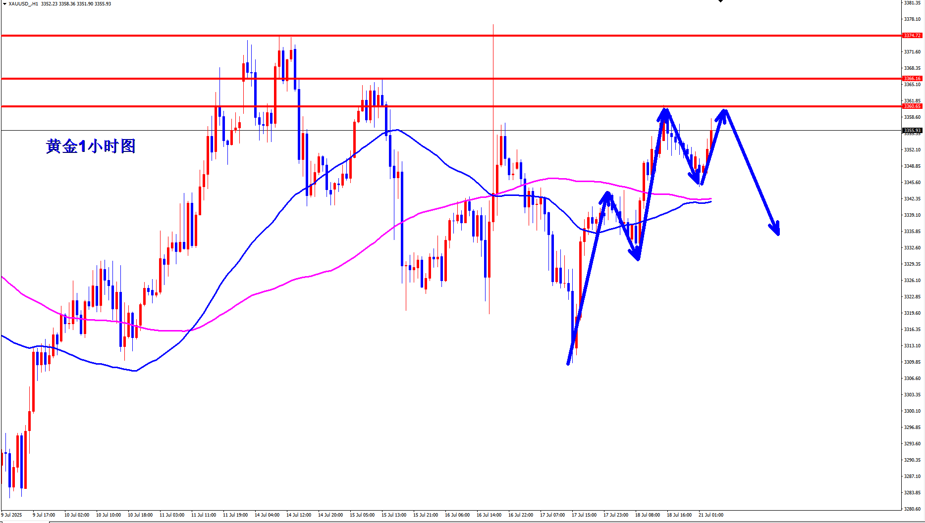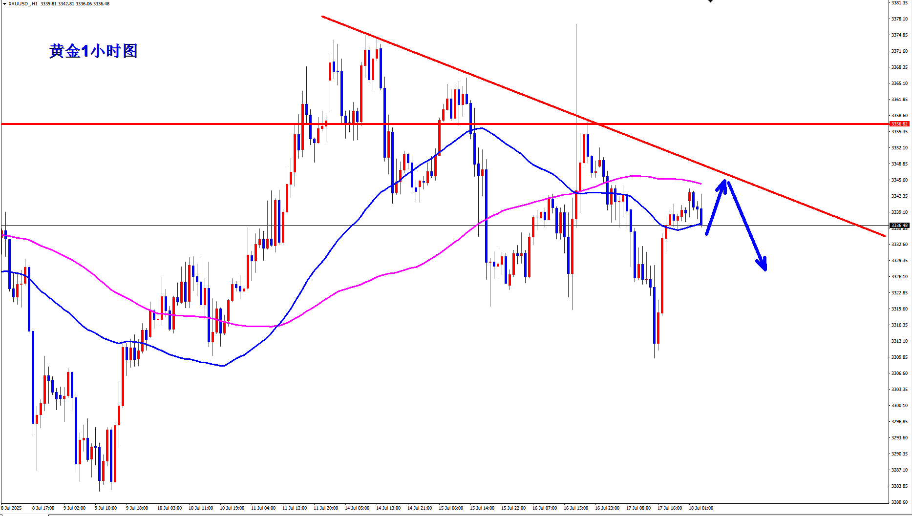 这两天黄金美盘总是因为消息拉升,昨晚川普呼吁美联储降息,黄金再次上行,不过从最近的行情来看,消息刺激的行情还是不可持续,黄金既然现在反弹上来,那么黄金早盘还是继续高位空。 黄金1小时还是整体是震荡下跌的走势,黄金下行趋势阻力下移到3350附近,黄金没有有效突破3350之前,黄金承压3350还是继续逢高
