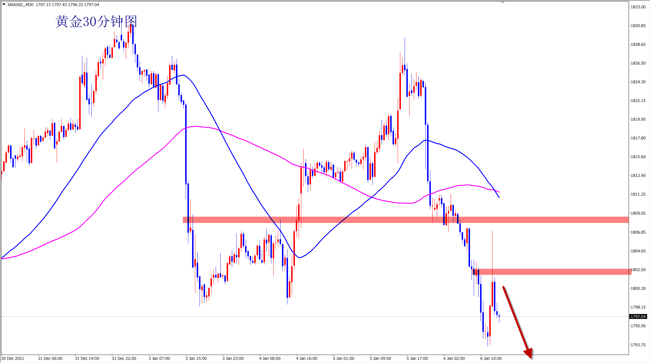 黄金昨日破位大跌,我们及时的改变思路,美盘1805空跌至1798一线收割!当前行情转跌,反弹就是干空,早盘依托1808的压力干空看跌,下方关注昨日1798的支撑,破位后看跌至1790甚至更低! 黄金高位遇阻,大阴杀跌,并且再次跌至前期的盘整区域内,上涨走势被改变,行情转跌!方向改变,思路就要及时的调整!行情转