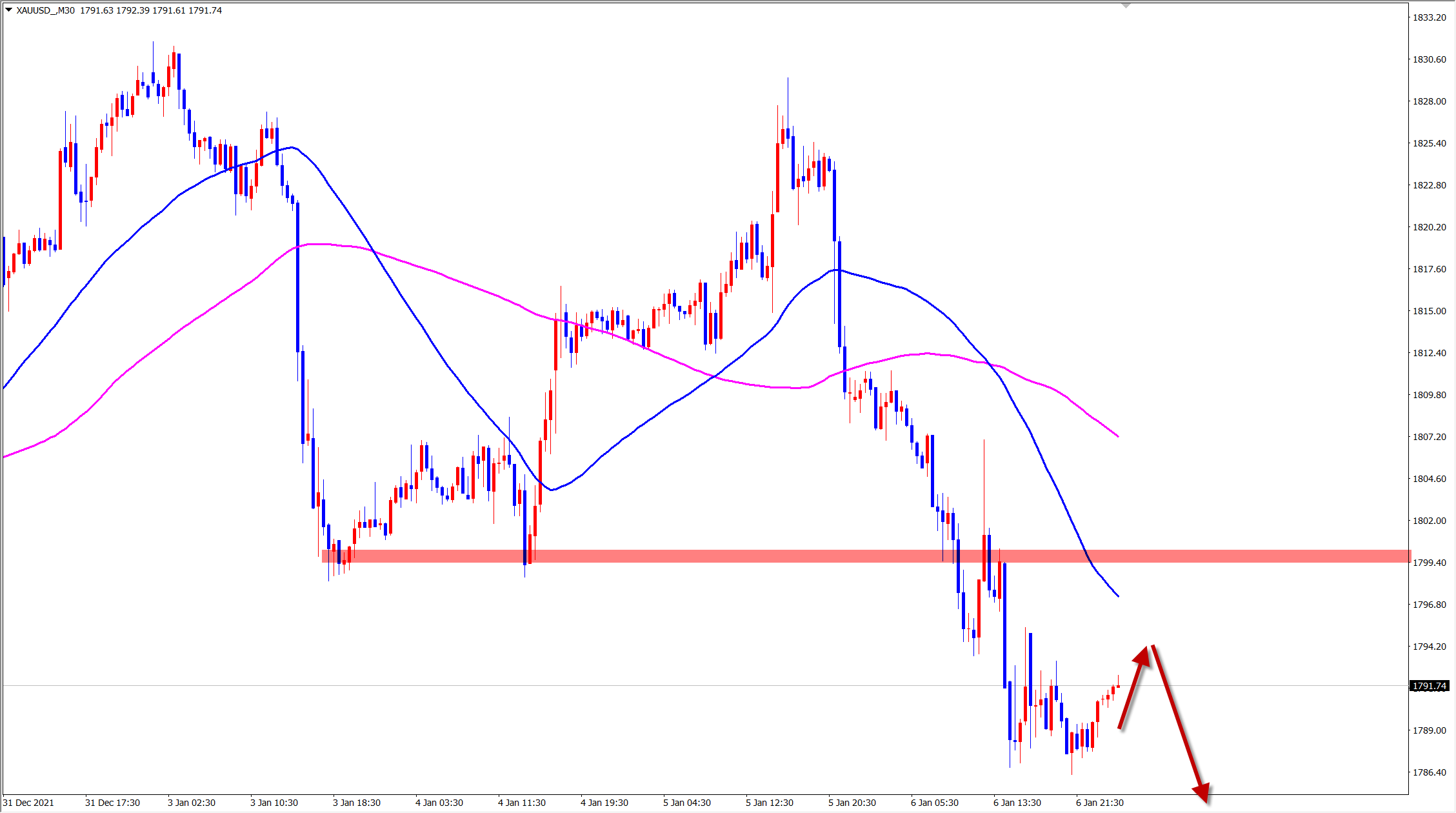黄金当前明显的趋势下跌,我们坚持顺势干空,从1827位置开始干空,一路跟随,空单已经四连胜到手,当前跌势不止,1800下反弹还是继续空,1795附近直接干空! 黄金高位回落,并且日线连阴下跌,跌破此前1798的支撑位置,然后反抽确认跌势开启,当前暂时受到前期回踩低点的支撑,而且今日是大非农公布的日子,行情
