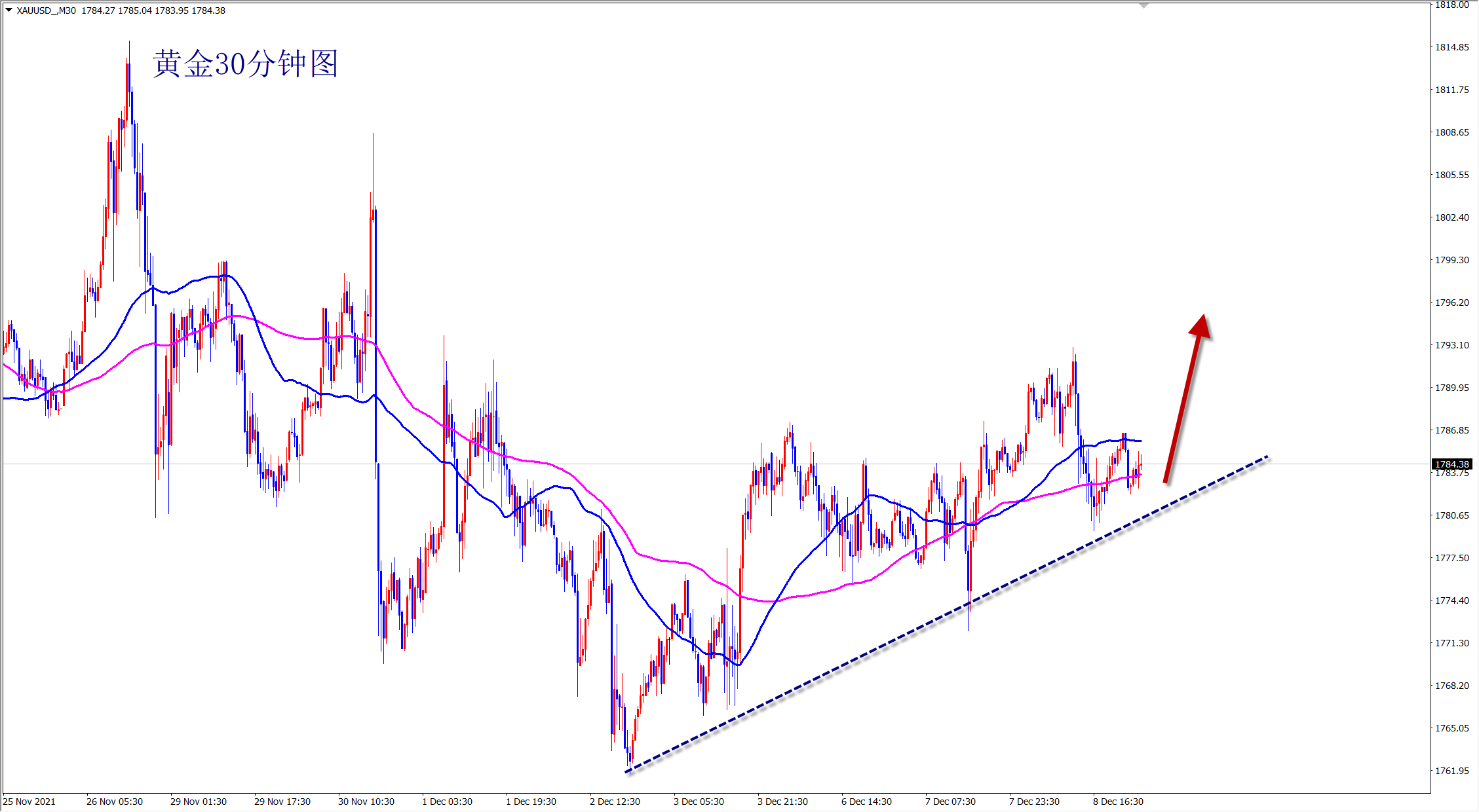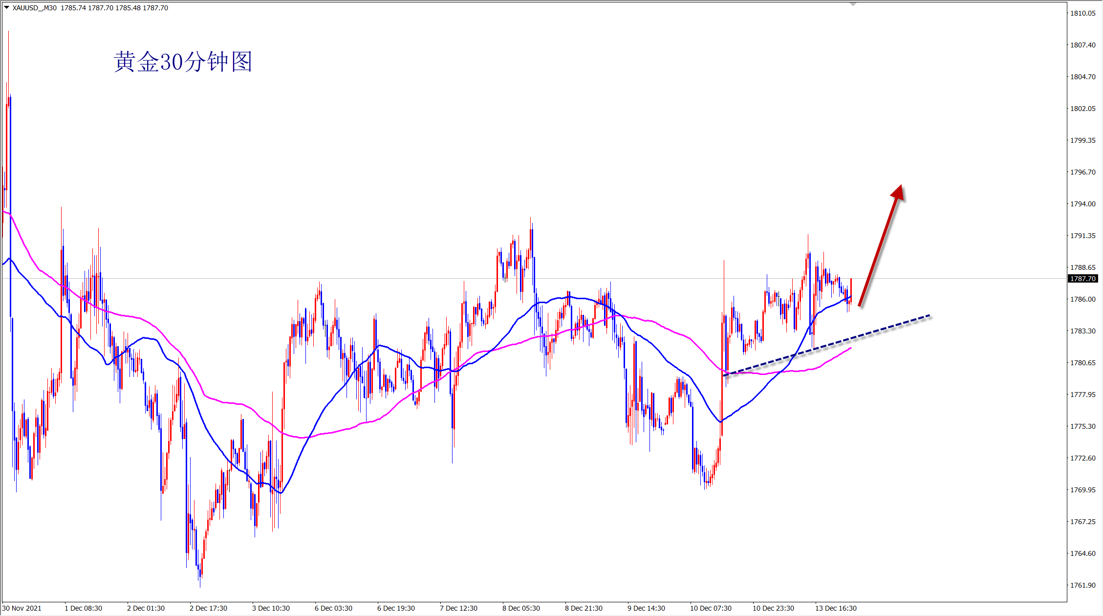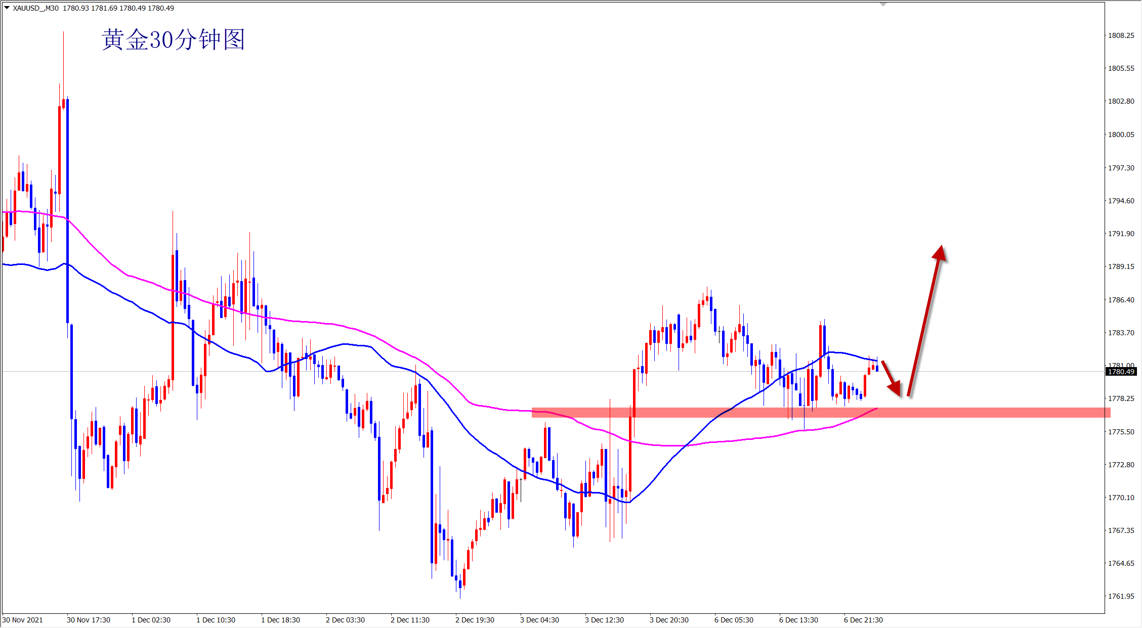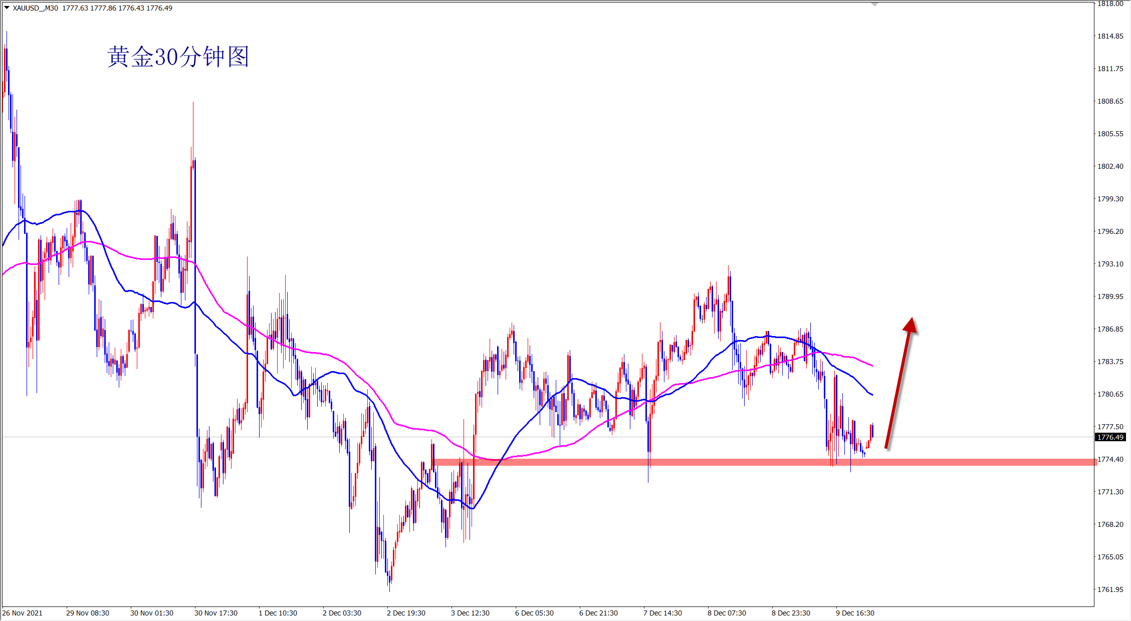 黄金昨日震荡回调,但是没有真正跌破1772的支撑,还是反弹上涨走势不变,今日继续维持低多看涨思路,早盘依托1772支撑直接干多! 黄金当前属于反弹走势,短线震荡,下方1772一线的支撑明显,此位置上黄金还是看涨干多,早盘依托此支撑位置继续干多!不破不立,破位翻转!黄金看似弱势回调,但是并没有跌破关键支撑,