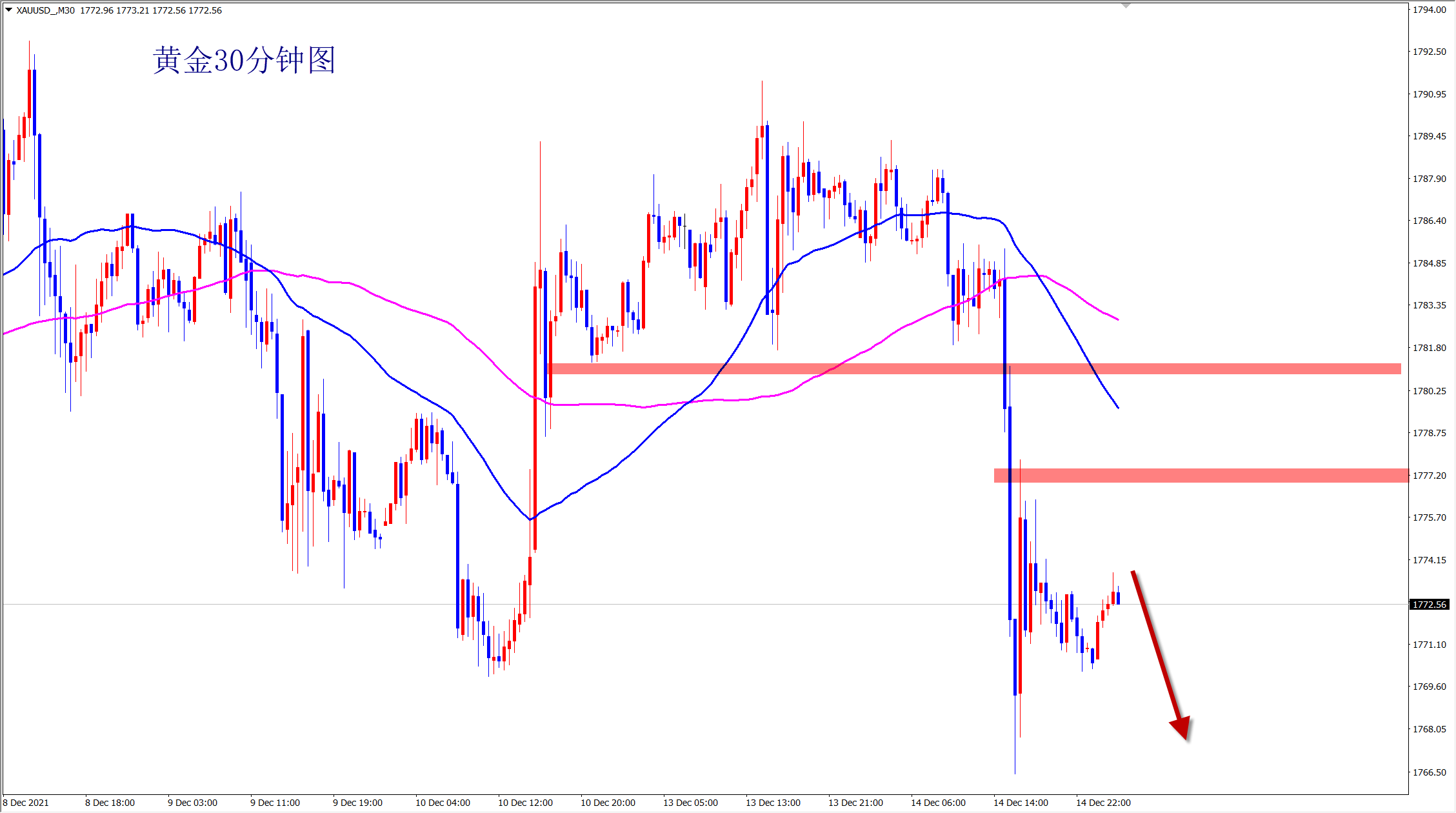 黄金昨日大跌破位后小反弹,但是反弹力度不足,今日早盘延续跌势,空头下跌继续,欧盘继续看跌干空不变,1778压力下空! 黄金经过连日震荡后最终破位下跌,方向已经选择,操作上就要顺势跟进!长时间的震荡后,最终破位下跌,绝不会一波结束,而仅仅是开始!既然是空,那就要跟上市场的节奏,昨日美盘已经提示转空看