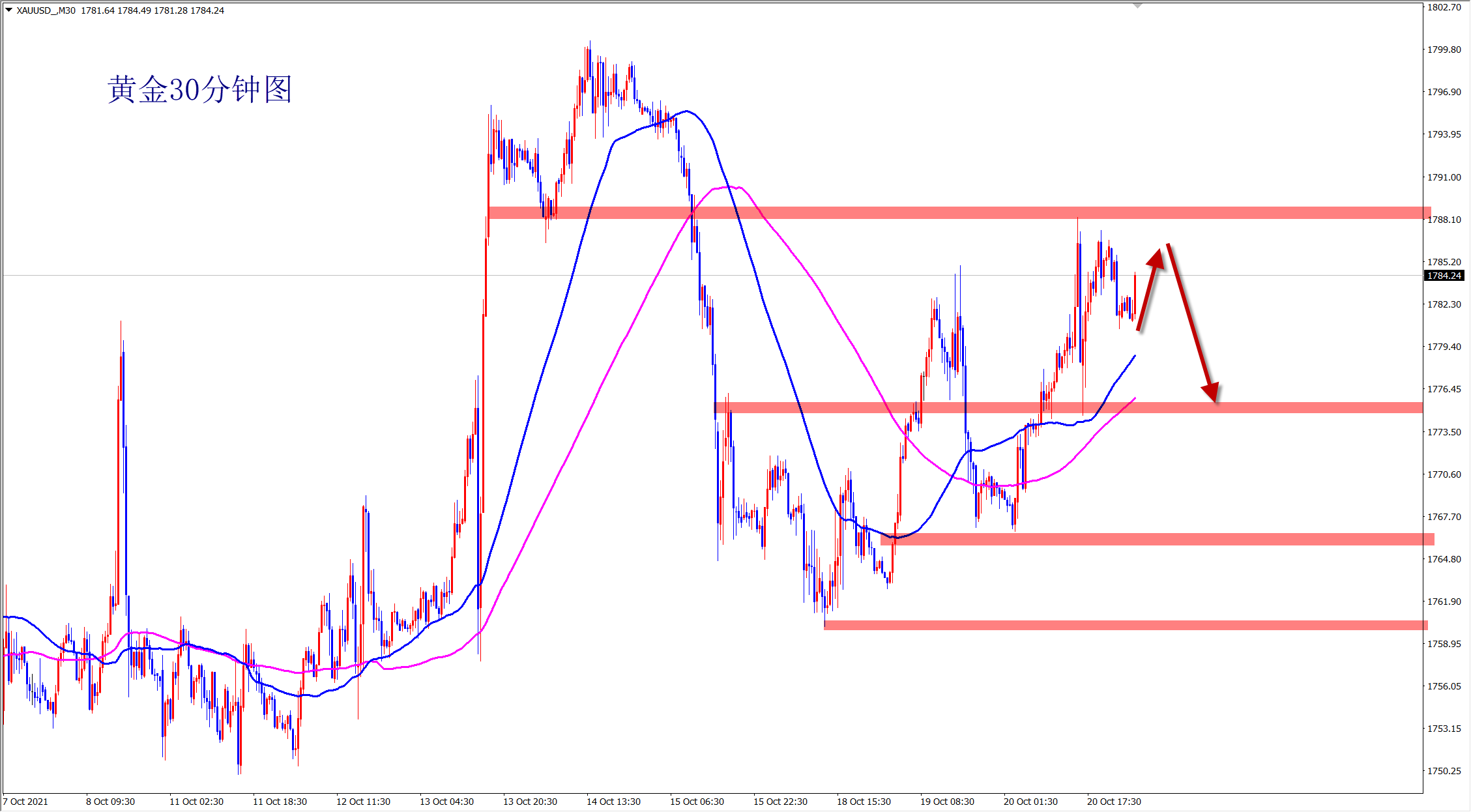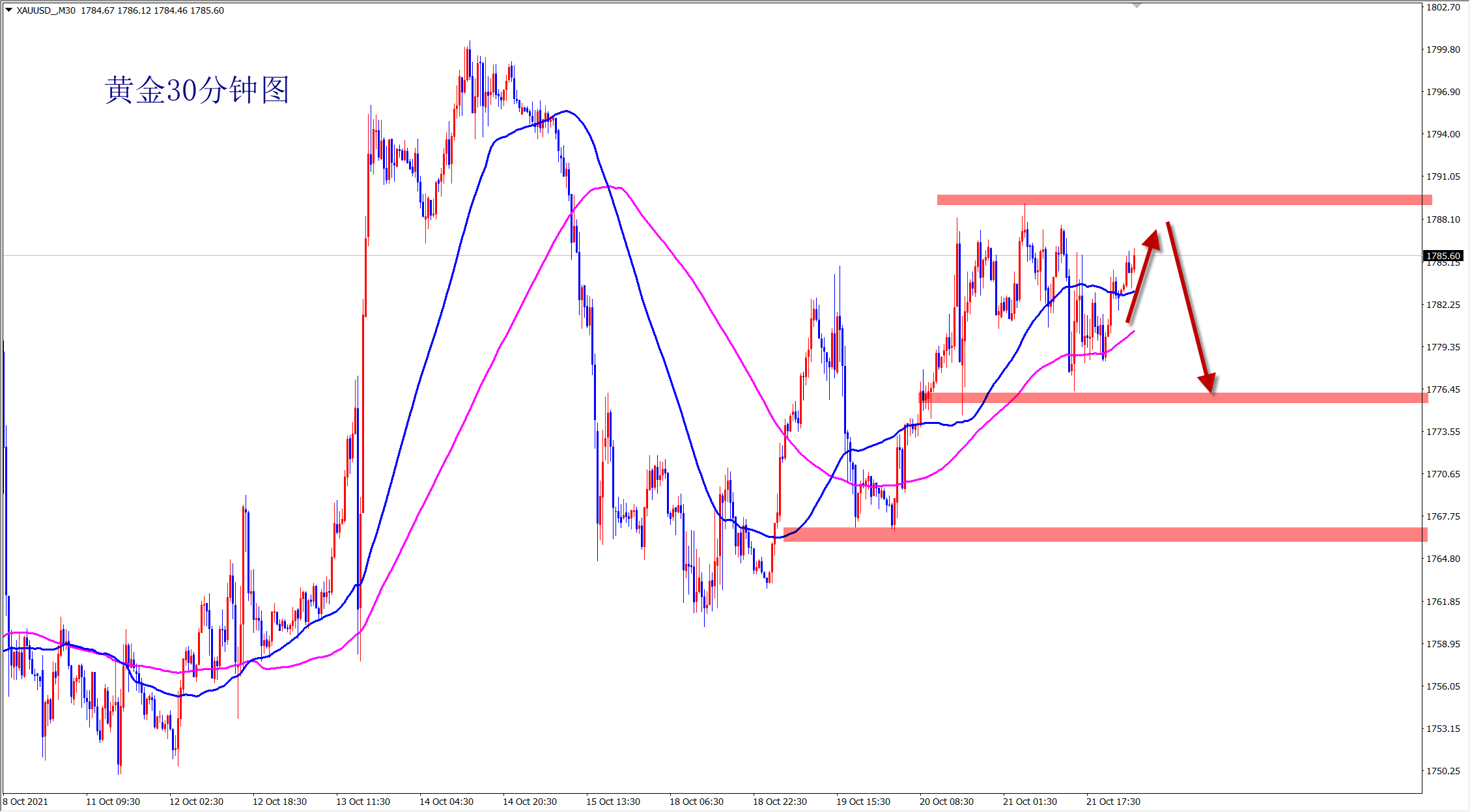 黄金昨日再次先涨后跌,昨日干多先是拿下三连胜,美盘转空看跌!当前行情还是震荡,早盘压力位置先空,1788附近直接干空! 黄金最近行情大涨大跌,日内随时可以转折,操作上一定要灵活而动,切不可死板顺势!当前下方的支撑非明显,就是1760一线,而上方的阻力则是1790和1800位置!不过当前行情回踩后都会再次探高,震