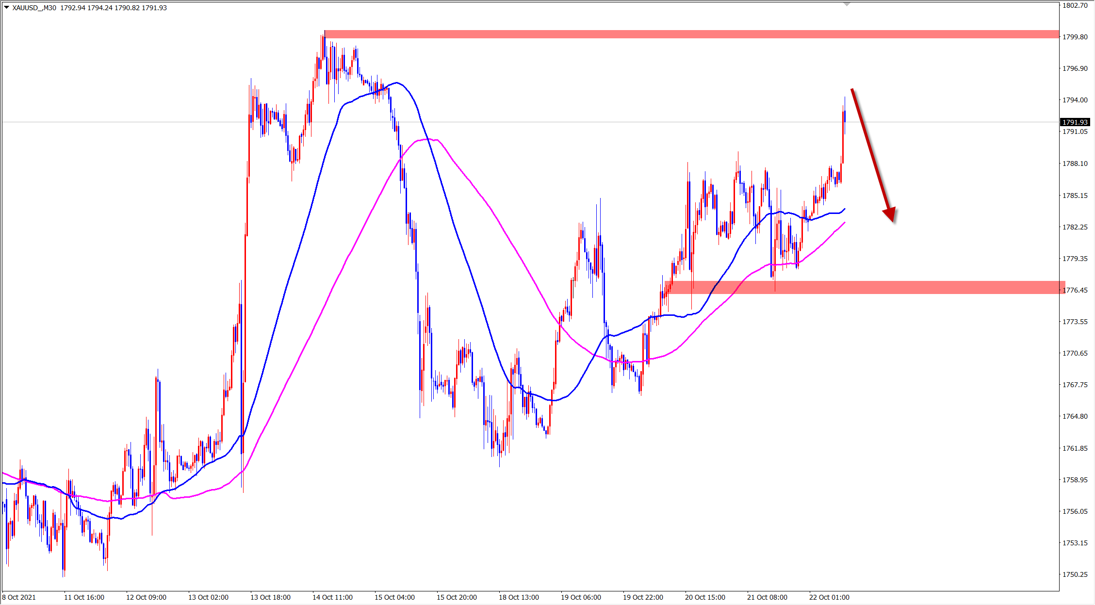 黄金最近的走势每次冲高后必然大幅回调,欧盘行情虽然再次新高,但难持续,1795压力直接干空! 黄金没有突破1800压力前仍是震荡走势,当前虽然是上涨反弹段,但已经属于压力区域,随时可以遇阻回调!操作上必然是高空!除非行情直接突破1800并站稳大涨,否则,我们决不可轻易追多!而是选择压力位置干空!
