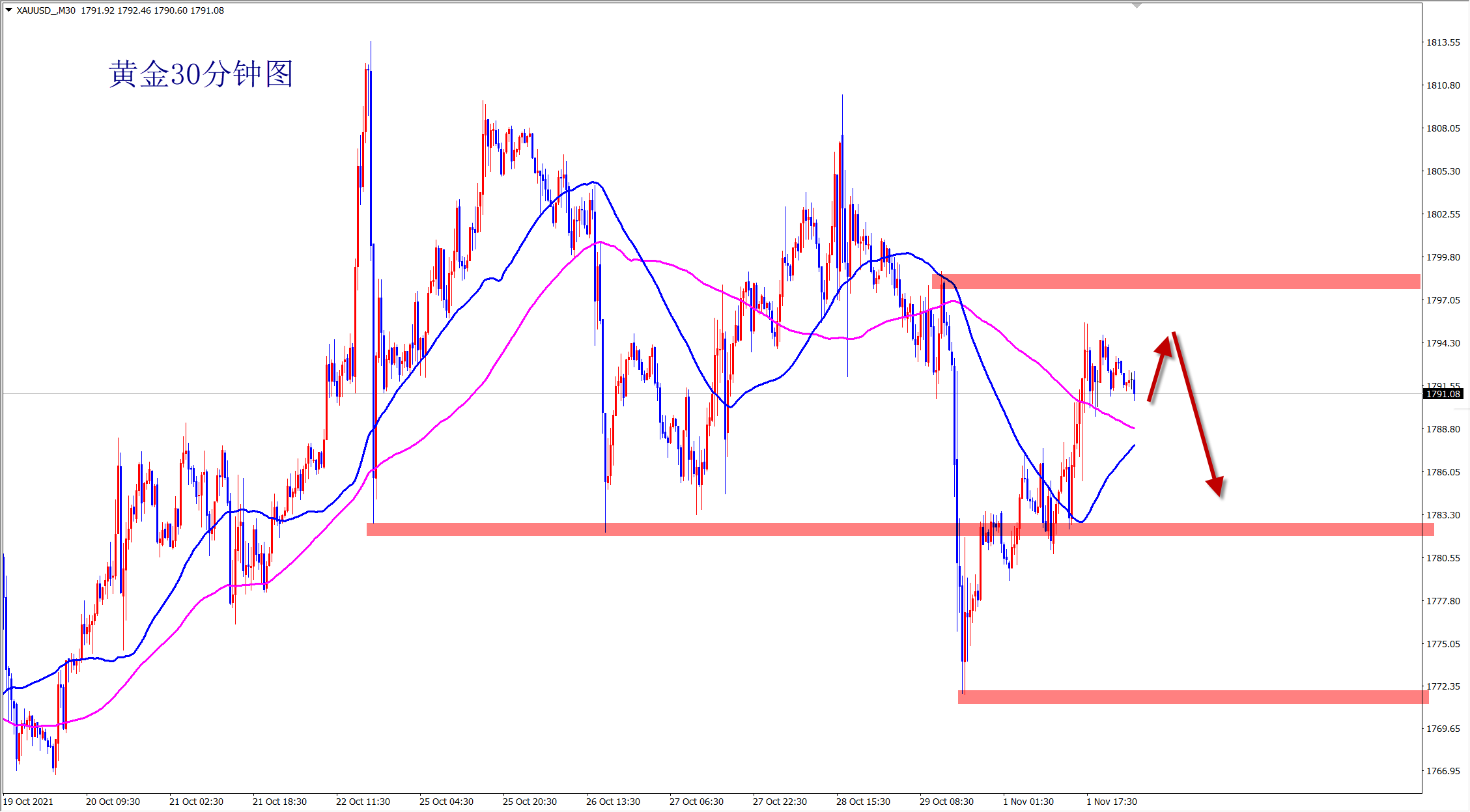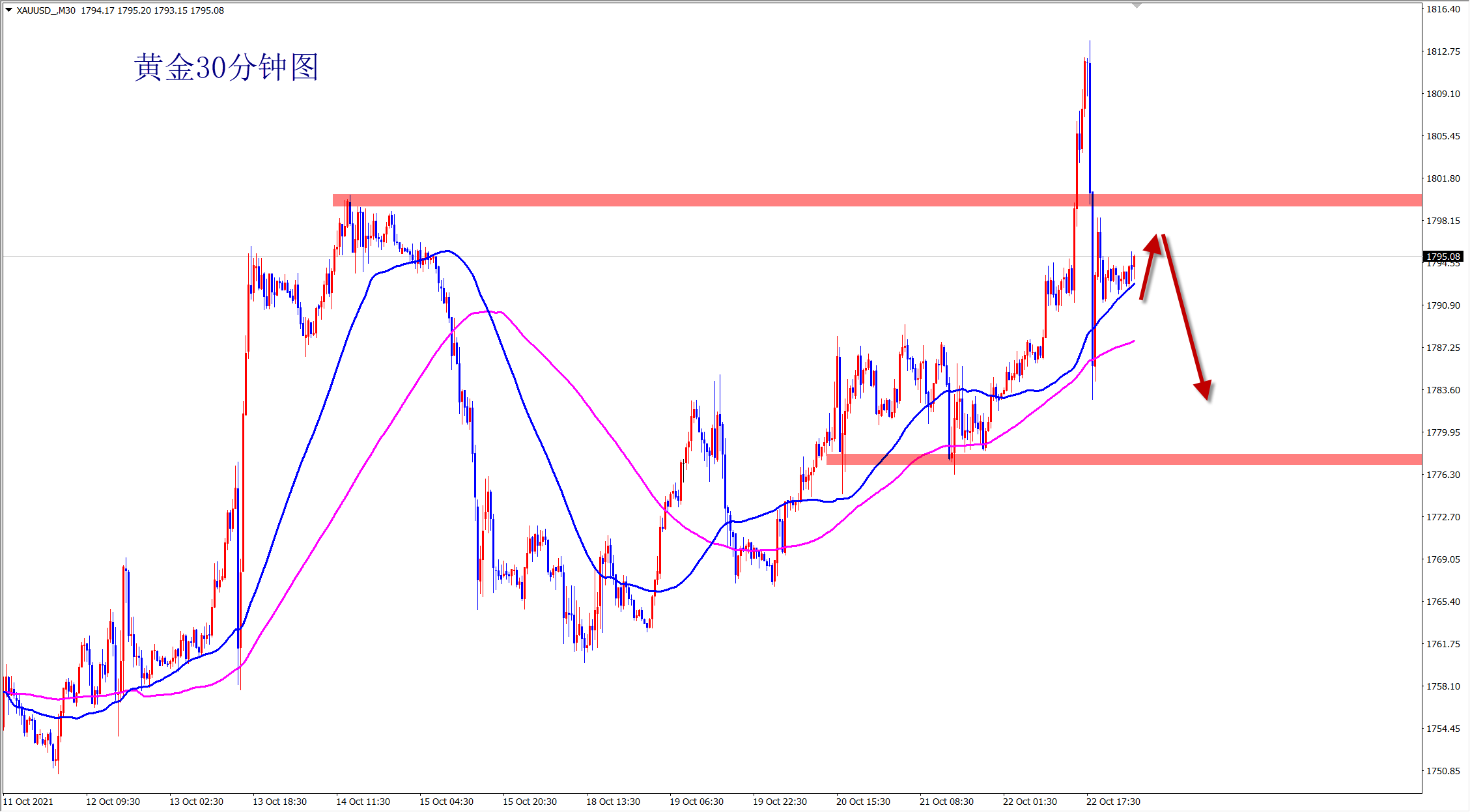 黄金昨日震荡单边反弹,但没有改变黄金大区间震荡的格局!震荡过程中涨跌不延续,早盘依托1800压力还是干空,在昨日反弹高点1795附近直接空! 黄金当前属于大区间宽幅震荡走势,大跌后可以大涨,大涨后也可以再次大跌!操作上只能守关键压力支撑反向操作,如果顺势,很可能来回打脸!这是最近最明显的规律!昨日黄金震