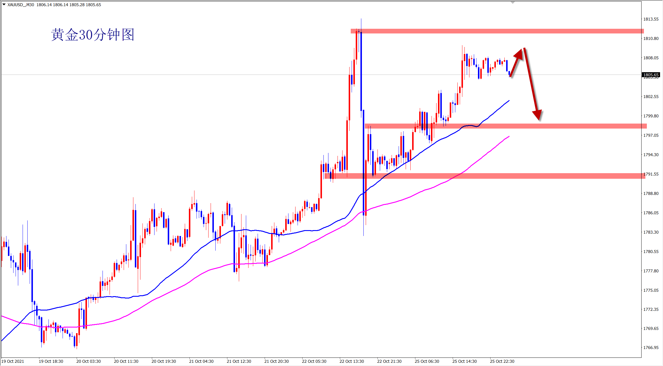 黄金周五冲高回落,并且是大跌,行情转空!当前上方1810一线压力明显,早盘1800附近先空! 黄金上周震荡上涨,但周五冲高后大幅回落,并再次跌回1800下方!行情上涨遇阻,强不再强必转弱,而且大阴杀跌,上涨多头被遏制!当前行情转空,筑顶过程中行情难免反复,但空头下跌已经形成! 早盘依托周五1810的高点压力干空
