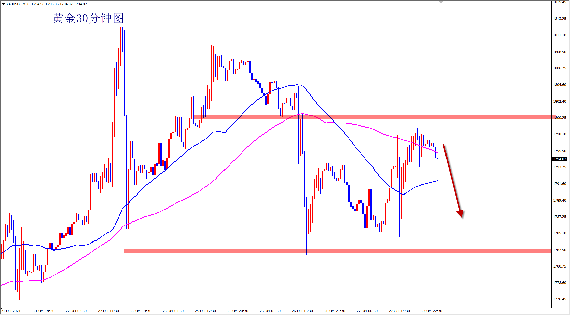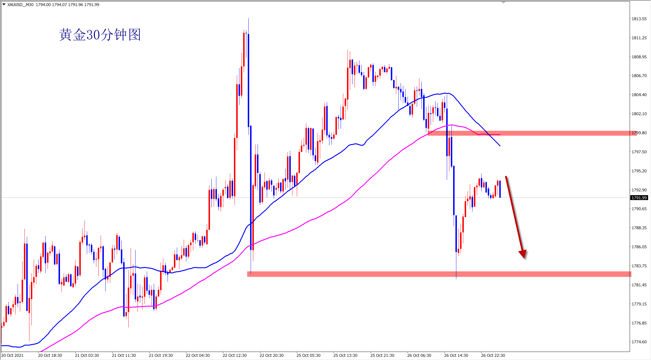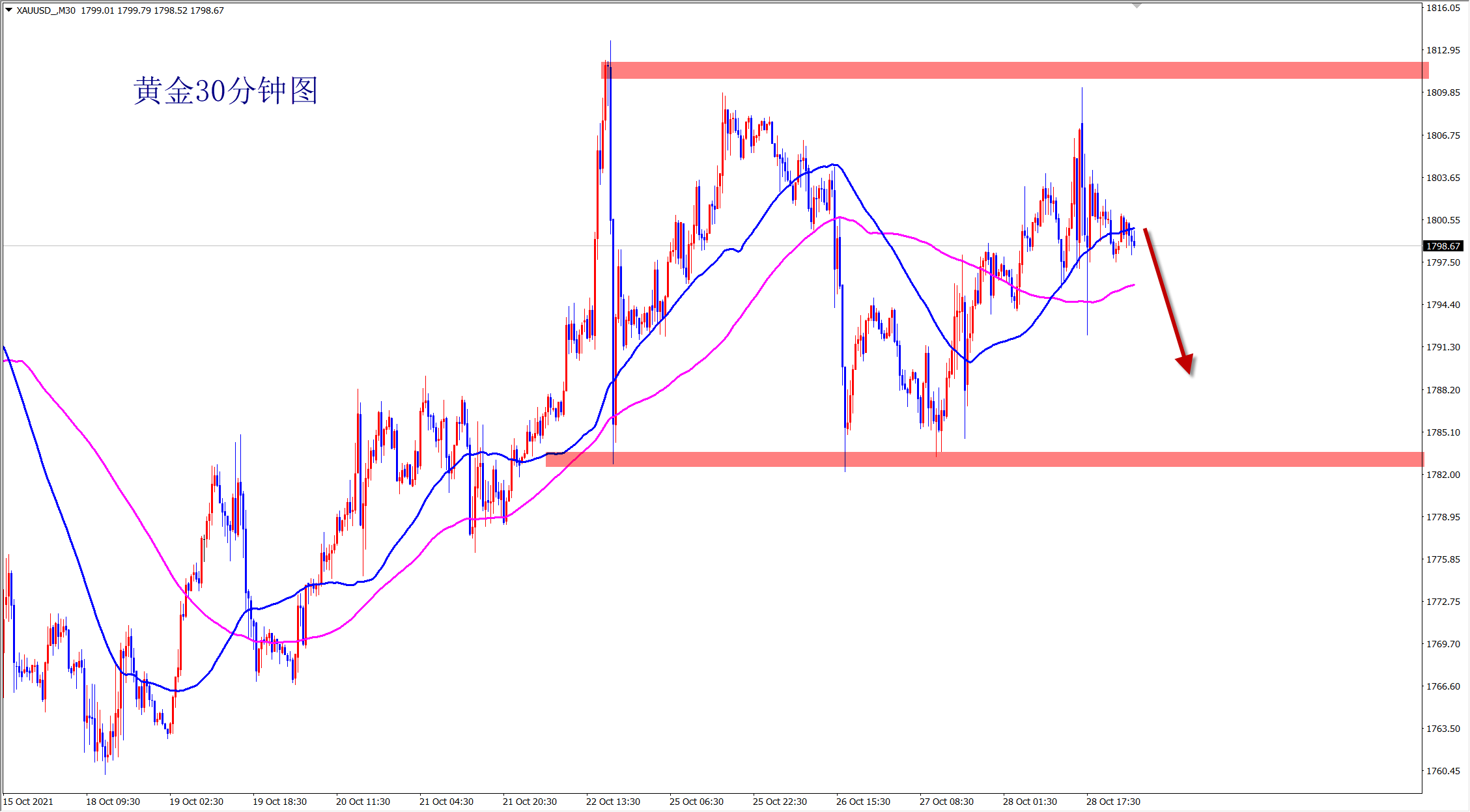 黄金当前继续围绕1783-1810大区间震荡,而且美盘来回绞杀,多空剧烈争夺,下周美联储利率决议估计才能走出方向,再此之前黄金以震荡对待,当前靠近上方压力,早盘反弹1810压力下干空! 黄金虽然大涨大跌,但是没有明确的方向,追涨杀跌容易两头打脸!所以昨日坚守高空思路,最终触及1810后再次大跌!今日黄金还是先空看