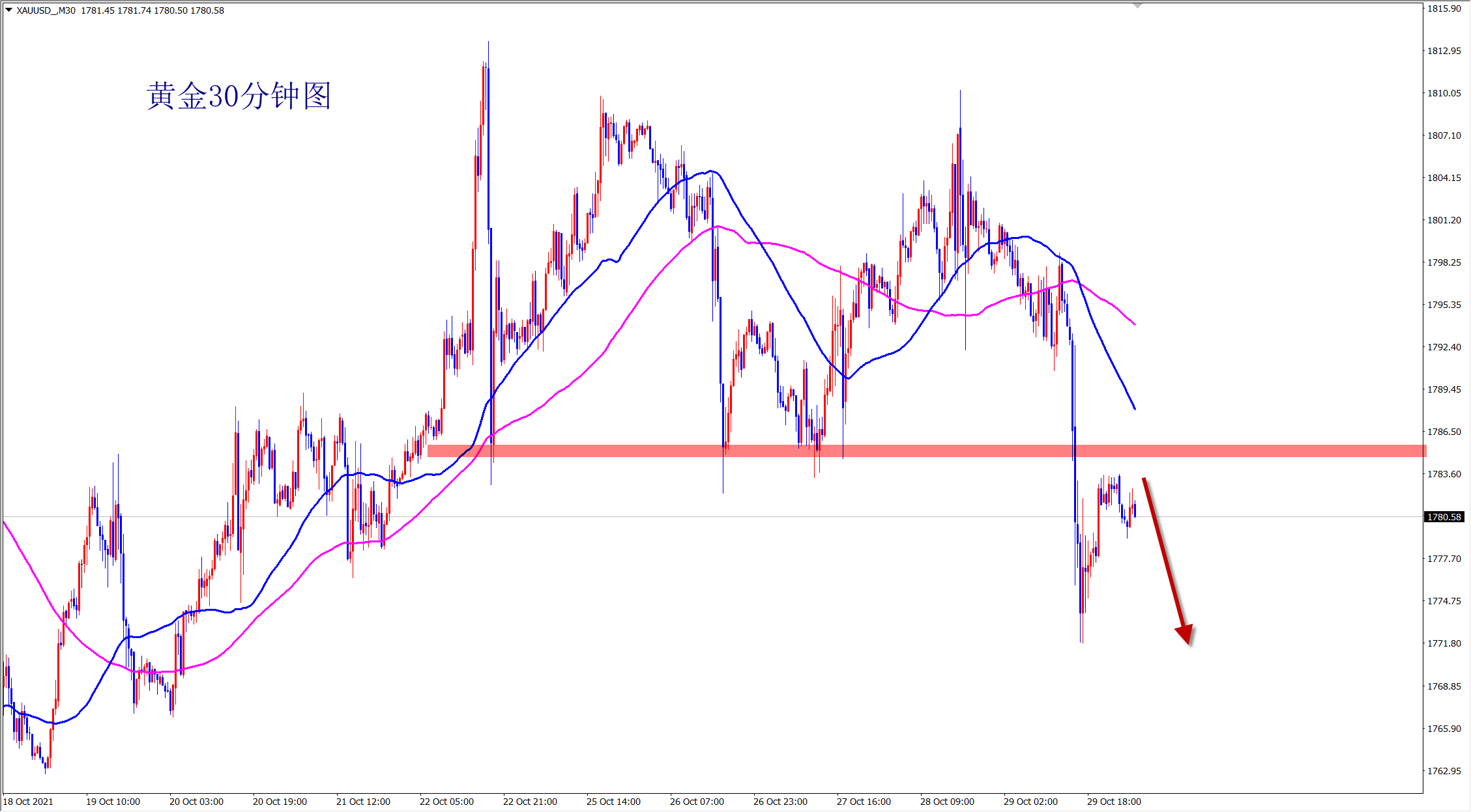 黄金周五破位大跌,并直达1772一线,当前行情破位,反弹遇阻前期盘整压力,还是空头行情,早盘1785压力位置直接干空! 黄金此前一直维持1783-1810区间内震荡,多空反复争夺,最终空头力量战胜多头,破位开启下跌!而且反弹遇阻,方向已经确定!早盘1785压力位置直接干空,下方的支撑分别是1770和1760位置! 本周是超级