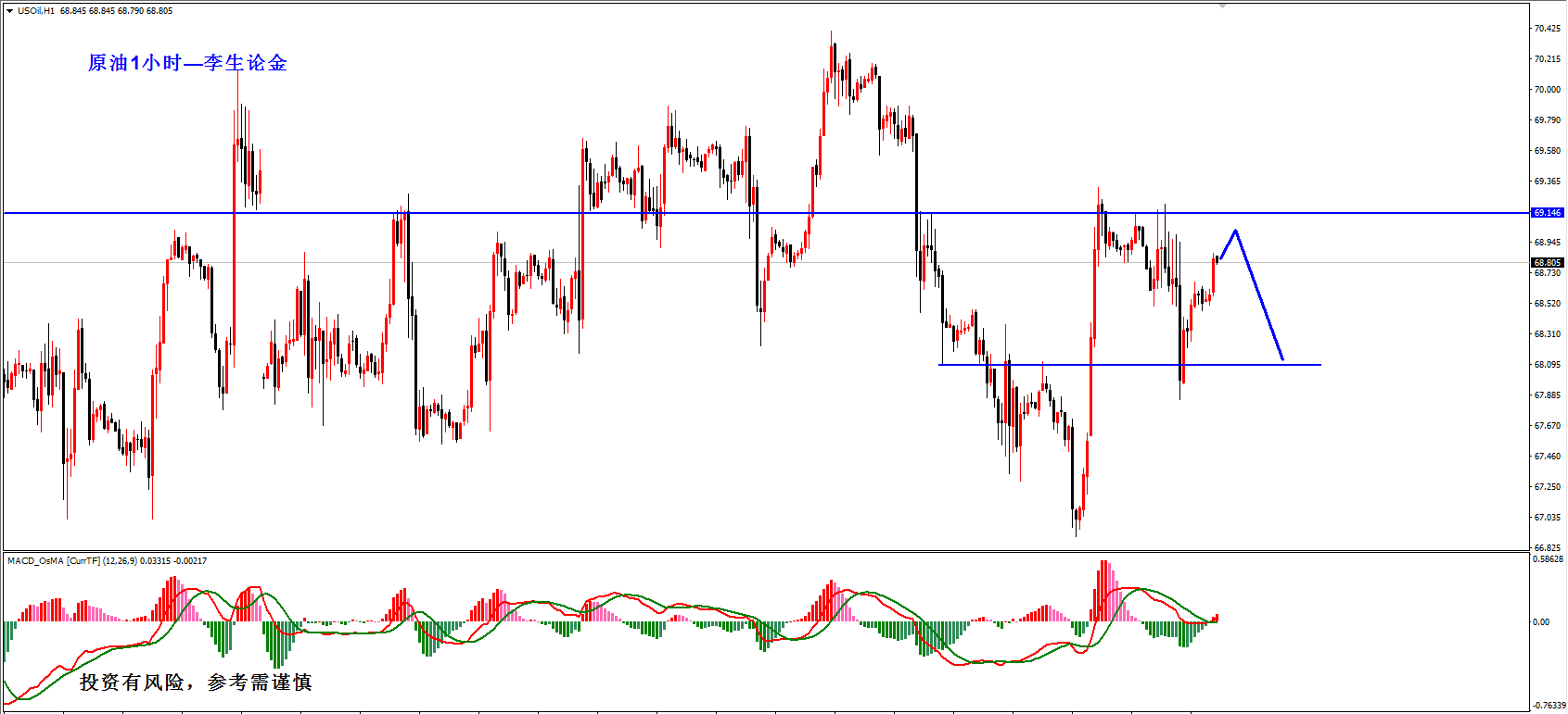 原油,上周没有延续反弹,向下再次试探了67的低点位置后再次反弹,目前多空的走势并不是很明朗,5/10日均线粘合,且最近每次涨跌都没有太大的延续性,整体还是以区间震荡对待,上周五快速试探68下方后再次反弹,目前处于68-69的震荡整理之中,上方阻力在69.3的前高附近,操作上,今天可以在68.9的位置做空,损69.4,目标68。