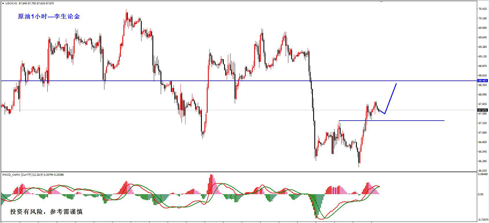 原油,近期受消息面利空因素的影响,油价自70附近快速下跌至66一线,随后并没有延续跌势,反弹最高触及67.9上方,近期油价走势无论是多还是空,都没有太强的延续性,消息面的影响往往起到了决定性的作用,这也是近期原油一直多看少动的因素,目前来看,空头的动能有所衰竭,预计还将有进一步的反弹,今天可以在67.4-67.5多,损66.9,目标68.4。
