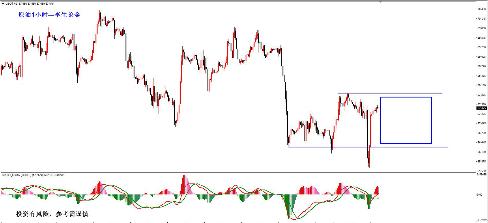 原油,消息面再次主导了市场,昨天受到欧佩克产量增加的影响,快速下探到65.6的新低位置,又由于美国对伊朗制裁的因素,快速重回67.5上方。油价昨天没能延续反弹,再次创出新低,但随后快速的反弹也表明了市场并没有一个明确的方向,这无疑为操作带来了很大的难度,所以最近一直选择观望,并没有参与,快速的过山车,多空都难有大的作为,短线预计将在66.3-67.8的范围内震荡整理,建议可以先观望。