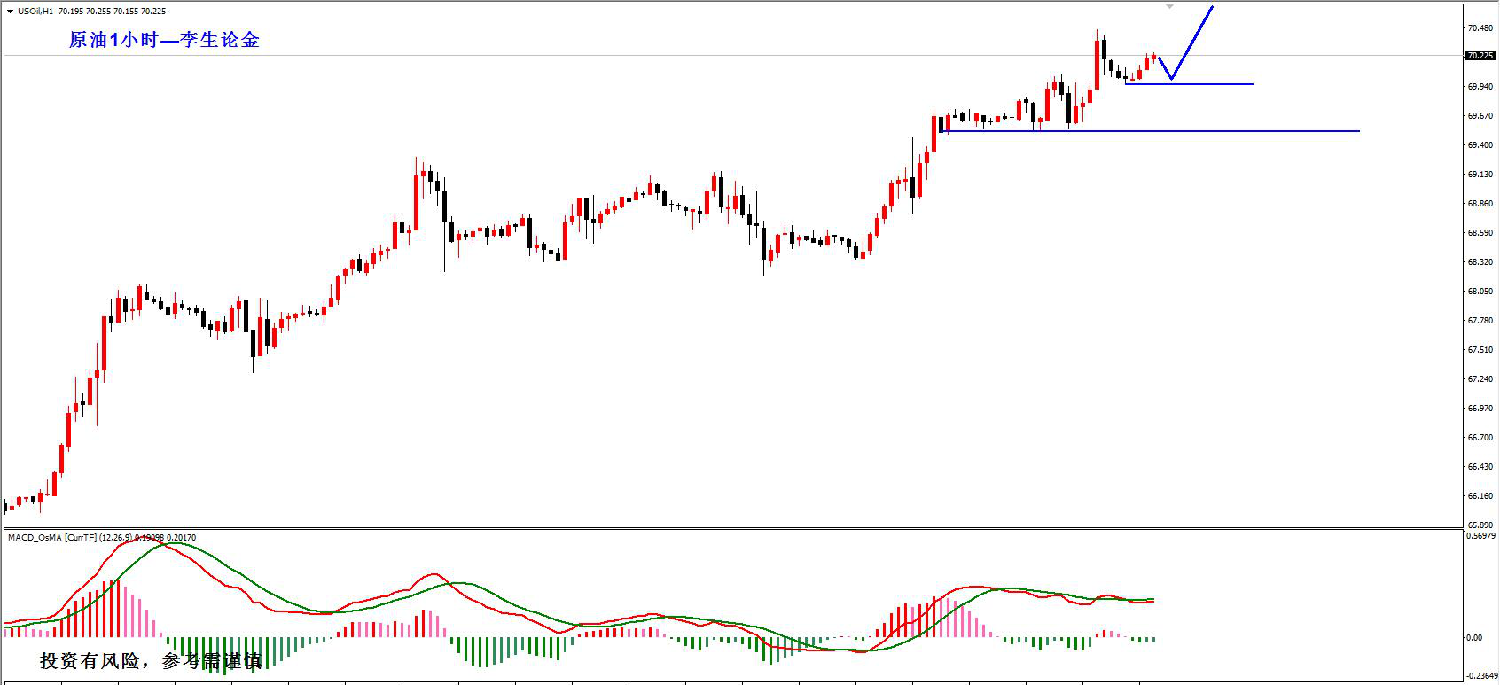 油价,昨天一直保持在高位震荡整理,晚间延续涨势最高试探70.5的高点,从64.4至今,原油一直保持强劲的上升动能,中间并没有遇到太大的阻力,整体上行的走势目前还没看到止跌的迹象,昨天一直维持的低点位置将是今天能否延续上涨的关键,日内可以以前低69.5下方为防守继续看多,建议回撤70做多,损69.4,目标先看70.7/70.8。
