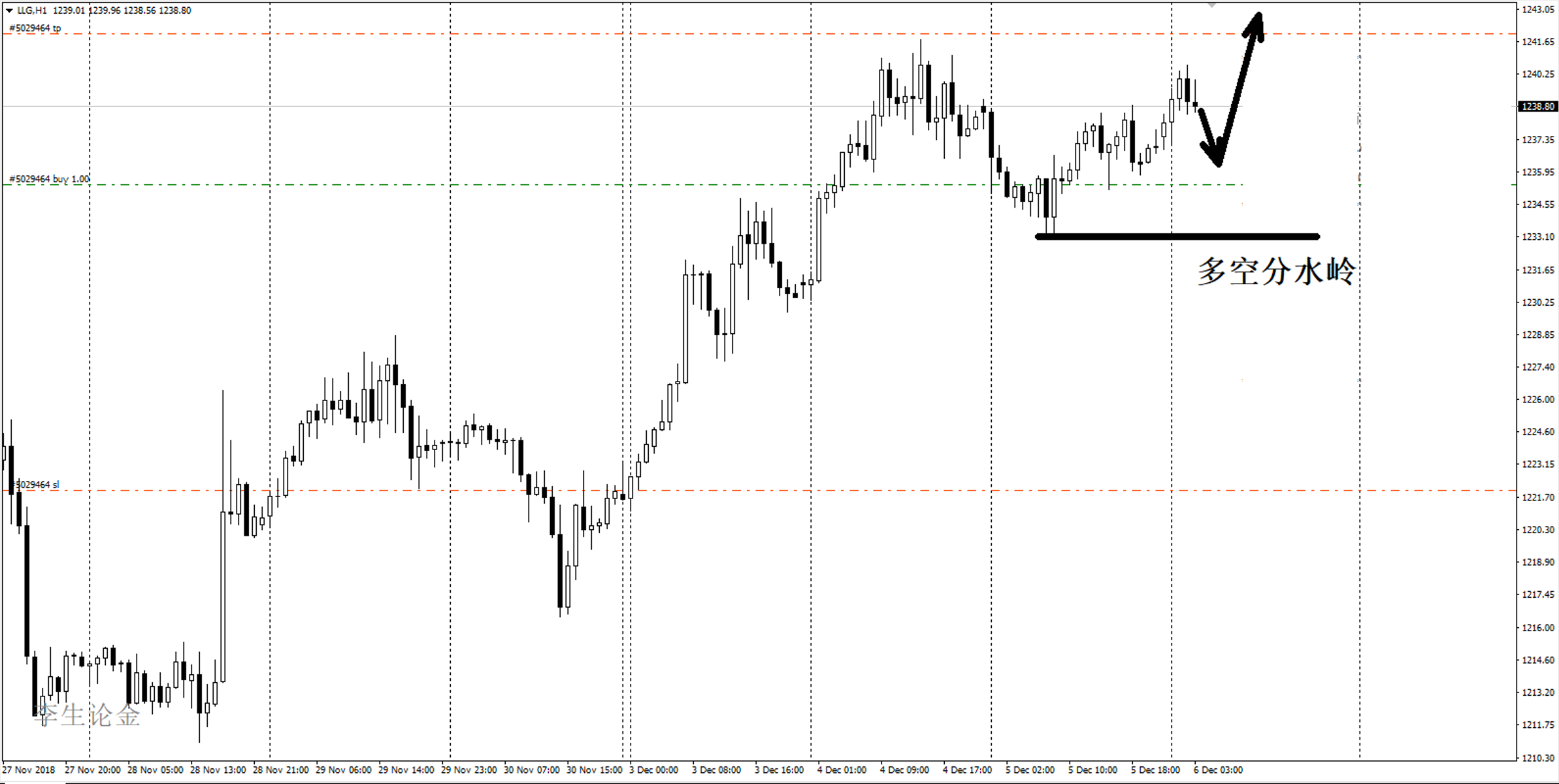 如图:1小时方面则是保持着看多为主,分水岭的位置放在昨天盘中低点1232的位置即可,而上方则重点关注前高点突破的进展,今天早间有所修正,但幅度不是太大,上升行情当中,只要前低点没有被击穿,那么台阶式的上升就继续。