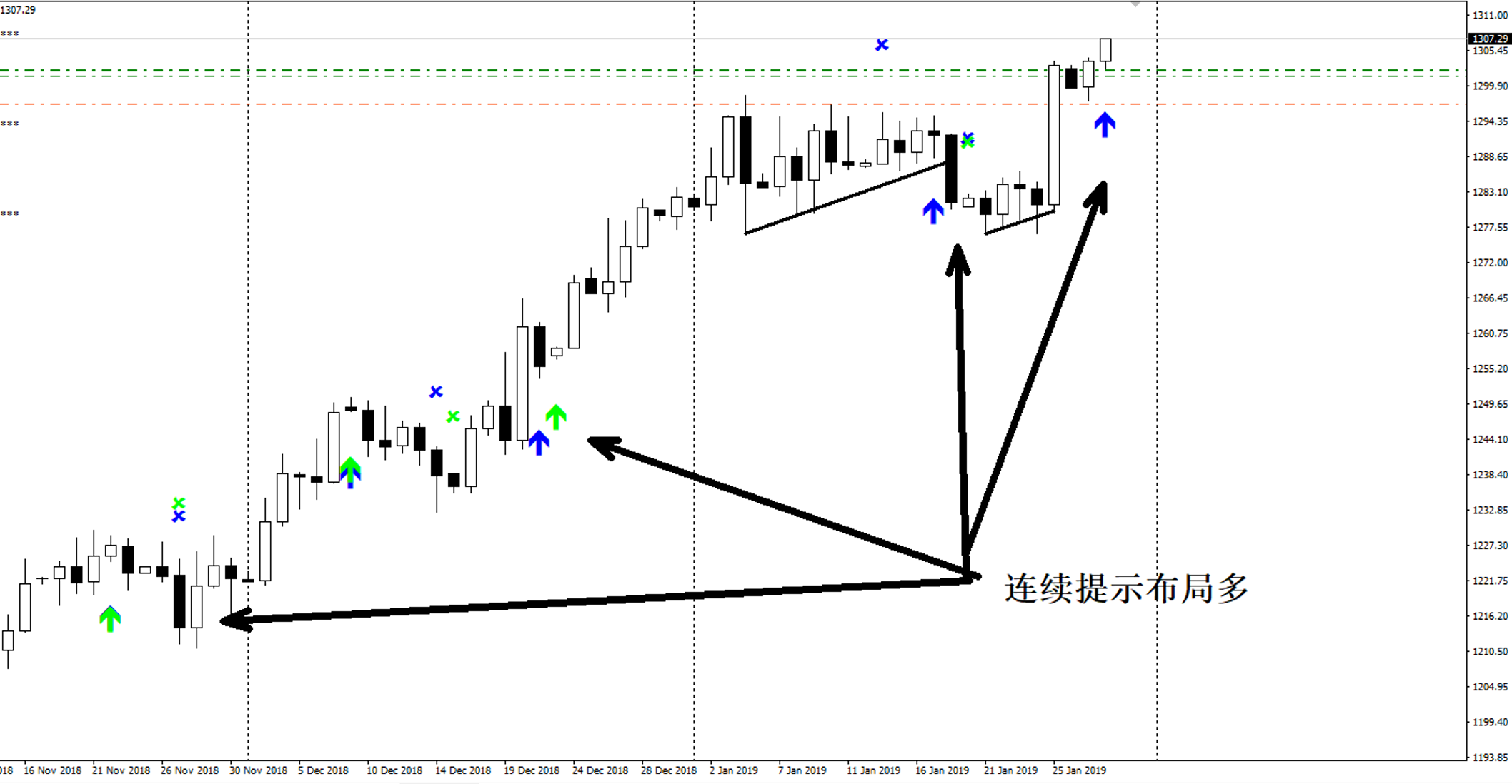 如图所示,强势的黄金价格将继续,目前手里持有1300附近的多单可以拿着,如果有朋友过度担心,那可以选择减仓之后再继续持有,但我并不建议大家去做任何的空单,因为在强势的行情当中,一旦去波逆势的单子,那么风险系数就会成倍的增加。