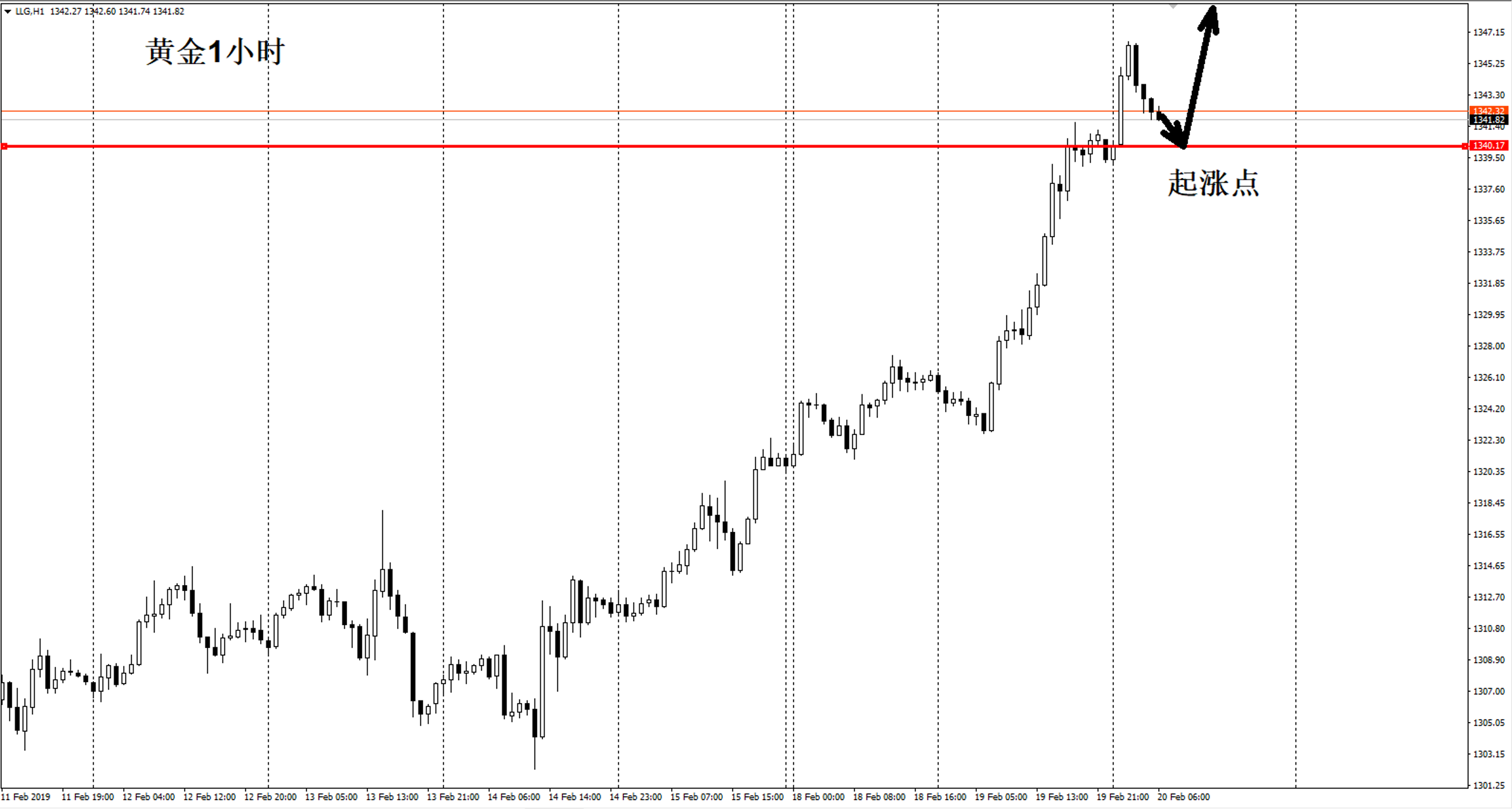 如图所示:1小时级别金价还是保持着强势,虽然亚盘时段价格向上,之后回撤向下,但再看看2月18日的行情走势,岂不是有点相类似,早盘延续强势格局,之后又回到了起涨点,迎来了二次的欧美盘延续上升,这一次,也同样的以此为支点看上升。