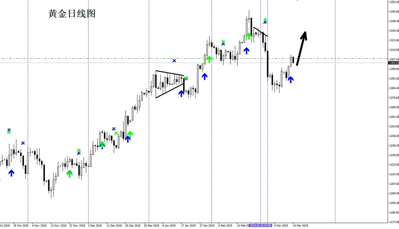 如图,日线方面,在过去的一波单边行情当中,分析系统几乎无一次提示空头行情,尤其是在大级别的走势当中,而这一次又在昨天出现了做多的信号,中线的波段还是维持着逢低做多的思路不变,上方则继续向上,重点还是在1303-1304的位置,以1300下方为防守位置即可,如若1300破位了,日内的行情会受一点影响。