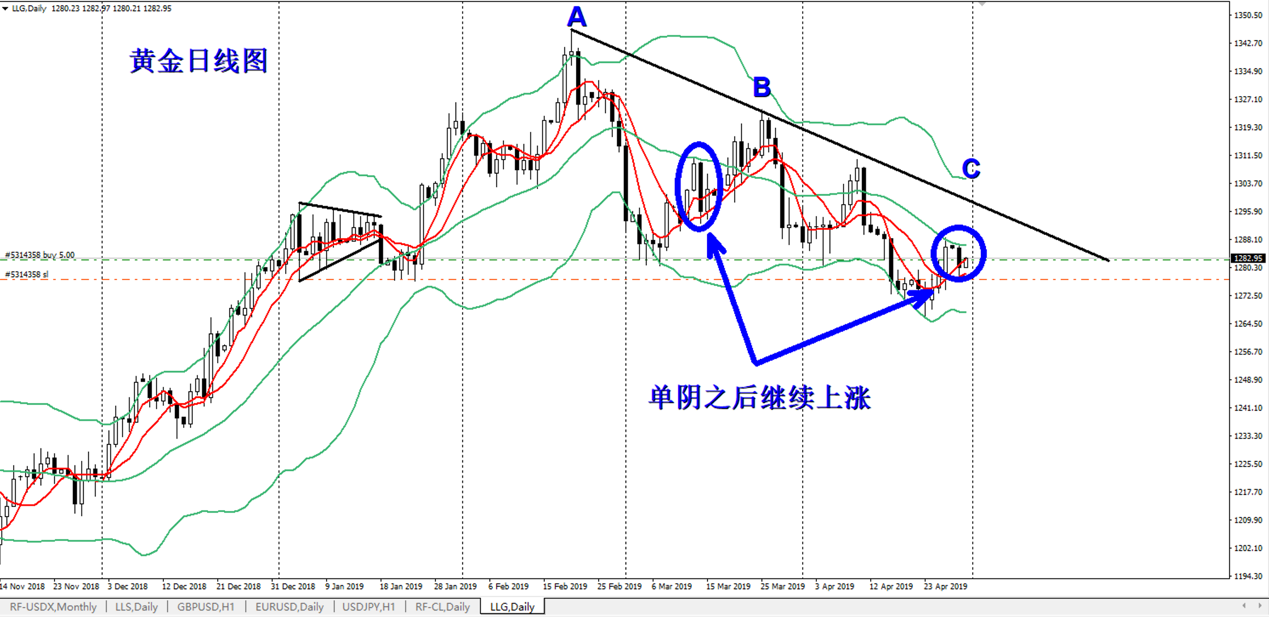 单阴,能否反转,其实纵观之前那一波反弹,1280-1325一波反弹当中,也出现过类似的情景,价格反弹之后延续着一波向上的走势,中间夹杂着单阴的回调,触及10日均线之后,并未形成较为明显的回调,尤其是在中轨触及那一次,与昨天的行情像极了,这一次也是一样,1277-1278昨晚的低点将成为今天的支撑点,有望延续一波反弹。