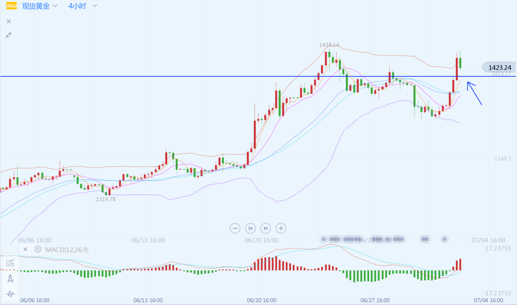 不过,这样的强势,要谨防像上次一样不延续,快速的拉升,而后面跟随的却是回撤修正,今天早间从1437已经跌到了1322了,达到了15美金,下方的重点在4小时5均线1416附近,暂时还不能急于追多,主要看亚欧盘的修正之后,美盘有机会再参与,这段时间价格波幅都比较大,要学会适应和习惯。