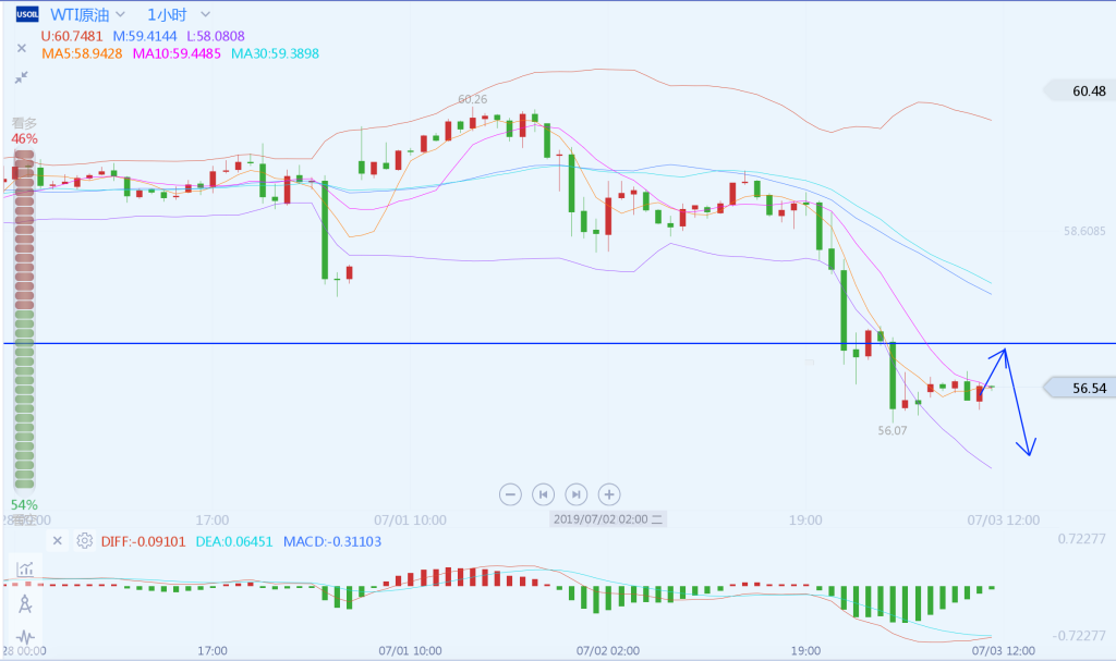 原油,昨天预计的是先跌后涨,结果来了一个瀑布,幸亏后面58的反弹没有做,只参与了一次59.2-59.30的空单,目前点位给的还是比较保守,58.2-58.00就离场休息了,结果,原油一直下跌到56附近,直接击穿了10日均线的支撑点位置,而今天反弹关注凌晨高点57.20附近,以此为压力点,继续看日内油价的回落调整,那么今天反弹可以考虑在此位置空一次,下方区间暂时看的不会太大,以0.6-0.8美金最佳。
