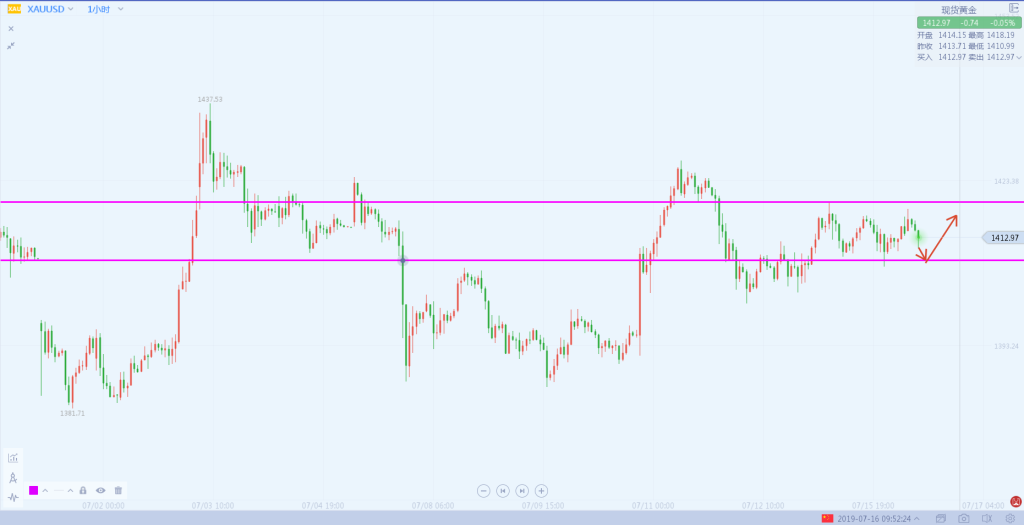 昨日,黄金继续上演小幅过上车,整体在1410-1420只能走区间,直到晚间才露出本来面目,这种小区间的整理无疑给操作上带来不少难度,不过就算是这样的行情,我们依然在谨慎的捞油。
