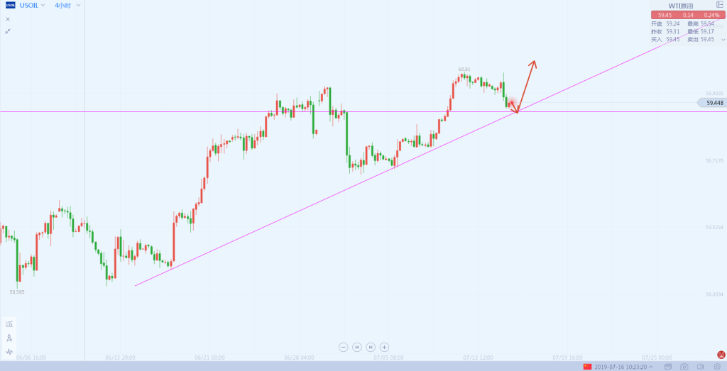 原油如图,昨天在60附近盘横都在看空,3日的向下整理方向上多少有些迷离,然而我们还是持有着60.2的多毫不畏惧,最终在60.8完美收割。今日,51.5-56.3形成的趋势线,以及前期的开跌口,形成的支撑,今天触及此位置可以直接多,如此划算的位置,此时不博何时博。不过一定要记着对市场的敬畏,带上止损,做好风控,下方防守位置58.5-58.3密集成交区域的底部位置。