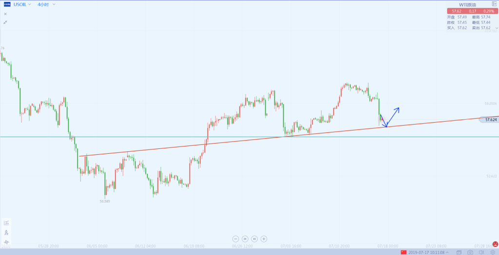 原油如图,4小时中之前形成反斜线,以及56位置的水平线,是本次震荡上涨的重要支撑位置,加之风暴的逐渐消退,以及API的利空,原油还剩今晚的最后一根稻草EIA,当这些走完更倾向于买预期,卖事实的走势。利空出尽便是利多,技术面也临近支撑位置,只有打破56位置本轮的震荡上涨才能宣告终结,所以今天原油更看好探底回升的走势,在数据前后先行向下探底,之后获得支撑在继续回归震荡上涨的节奏。