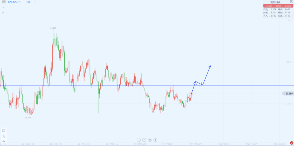 白银如图,最近黄金在突破六年来高点时,白银却走的比较弱,虽然金银比被拉开很多,但是白银的自身属性本就弱于黄金,所以不能一味的抱着补涨的思路。不过在白银的周线中一旦突破16.3那么将是一个很好的见底信号,介时如同黄金打破1365一般的加速。
