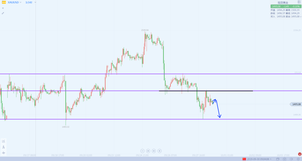 1:黄金1497-1498做空,损在1503,目标看向1483。