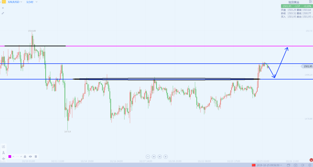 1:黄金回撤1497-1498做多,损在1492,目标看向1510。
