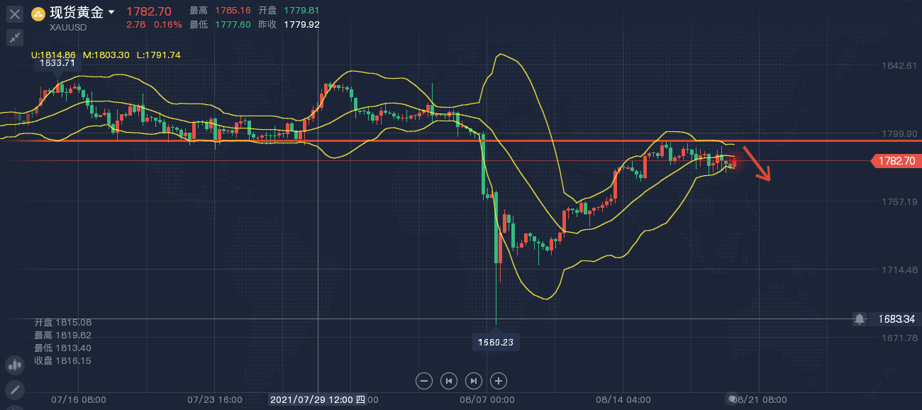 黄金方面,本周基本维持1800美元下方震荡,虽然美元刷新了新高,但是阿富汗政局的动荡限制了黄金的跌势。日线级别,布林带开口向下,有走平的迹象,价格徘徊于布林中轨附近运行,受到中轨的压制,价格多次试探,均未能做出有效突破。4小时,布林带持续走平,价格保持横盘整理态势,上方1800美元顶底转换位置阻力较为强劲,预期短线很难做出突破。日内操作思路反弹高空为主,上方关注1795一线阻力,下方关注1770附近支撑。