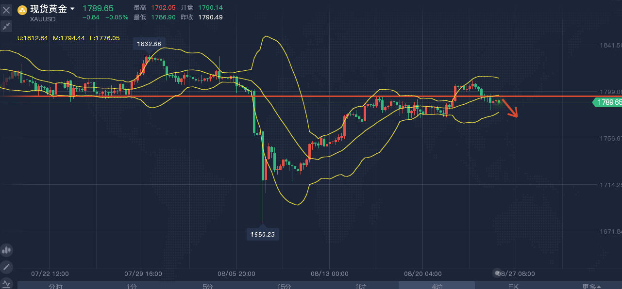 黄金昨日小幅回落,价格跌破1795一线支撑,重回前段时间的震荡区间,日线级别,布林带收口,价格小幅走低,目前价格在中轨附近徘徊,进一步试探中轨支撑,短线走势偏弱,在跌回至1795下方之后,后市大概率又会陷入1795-1770区间震荡。4小时,价格跌破布林中轨的支撑,形成阶梯式的下跌,而上方1795一线支撑变阻力,成为了日内需要重点关注的阻力位置,目前来看,日内价格延续昨日的跌势,有进一步下跌的空间,短线暂时先看空,下方关注1770一线支撑。