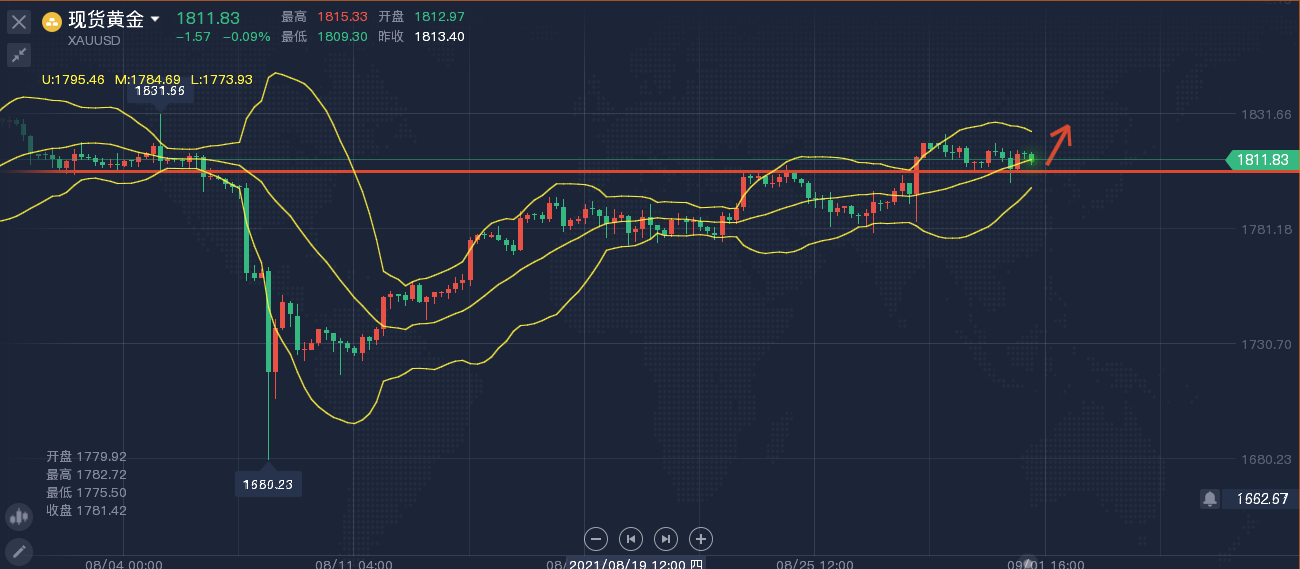 黄金方面,本周基本维持在1800美元上方小区间波动,大概率是由于本周即将迎来非农数据,市场也在等待数据的公布而确定方向。日线级别,布林带走平,价格运行于中轨和上轨之间,阴阳线交错横盘整理,短线方向并不是很明确。4小时,布林带收口,布林中轨在K线下方形成一定的支撑,价格维稳于1800支撑平台上方盘整,日内操作思路震荡偏多,只要不下破1800,就暂不先不去空,下方关注1805一线支撑。