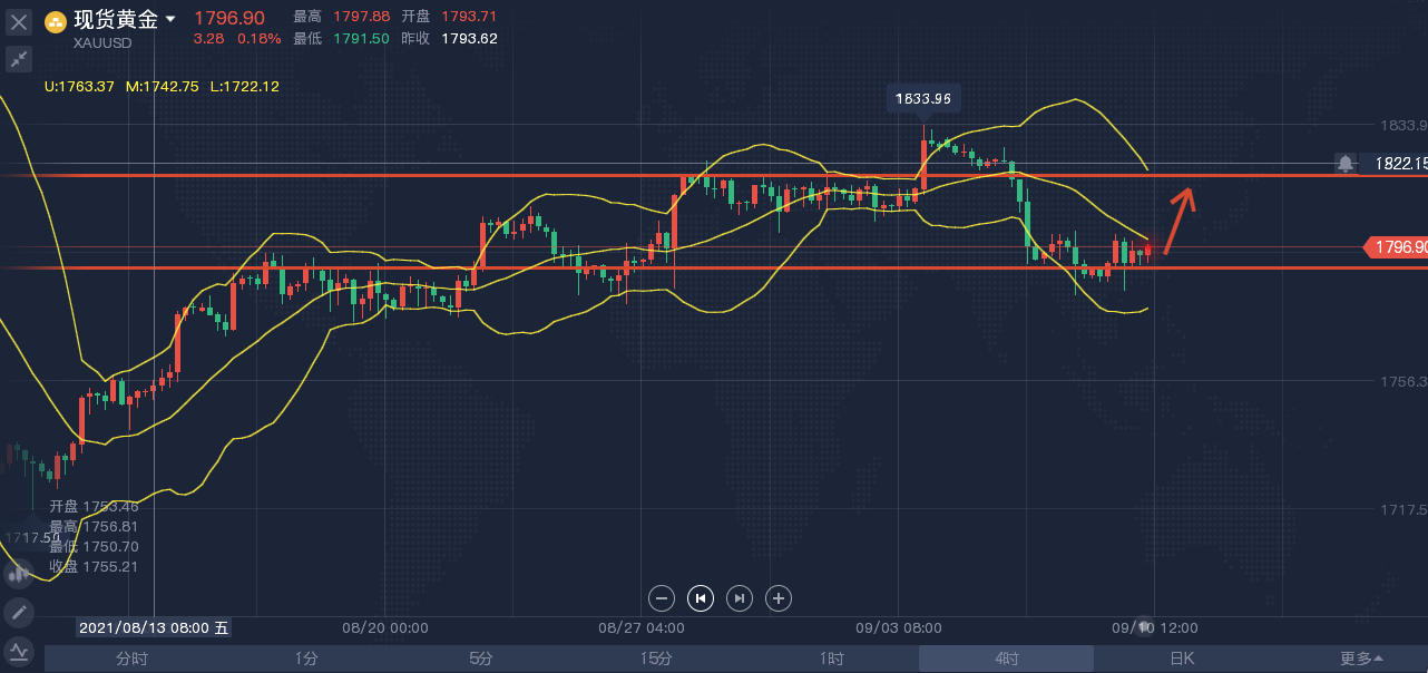 周四金价小幅上涨,因美元追随美债收益率走低,欧洲央行宣布缩减购债也令美元承压而利多金价,不过,昨晚公布的美国上周首次申领失业救济人数创下6月末以来最大降幅,显示劳动力市场继续向全面复苏迈进,强劲的初请数据及美联储鹰派官员的讲话限制了金价的涨幅,金价目前仍然承压于1800一线,能不能继续延续反弹,就看这个位置的突破情况。