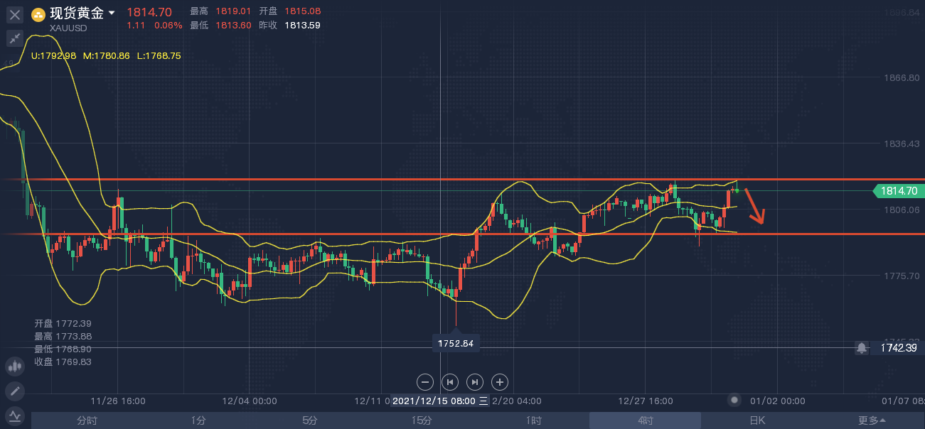黄金方面,价格依旧保持着震荡的态势,昨日小幅下跌后快速拉升,短线的走势偏震荡,在没有突破关键支撑阻力位置之前,方向上并不是很明确。日线级别,布林带开口向上,价格在回调触及布林中轨后企稳拉升,说明下方中轨支撑还是较为强劲,但价格在两次向上试探1820一线,均未能做出突破,日内需要关注这一位置的突破情况。4小时,布林带走平,价格自下轨反弹至上轨附近遇阻,整体波动不大,短线有回落的需求,日内操作思路暂时先看一波回落,上方关注1820附近阻力,下方关注1795一线支撑。