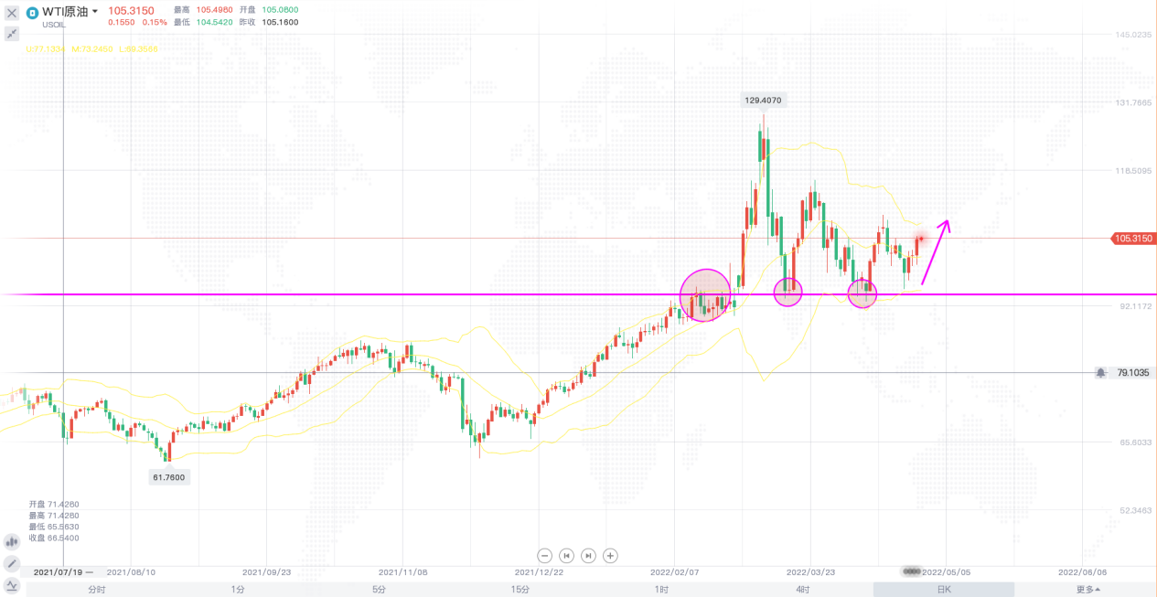 整体来看,原油价格在经历了几次的回撤,都没有下破突破下方94一线的支撑,形成了高位大区间震荡,整体走势还是震荡偏多,地缘方面的俄冲突不解决,油价很难有大的回调,同时,现阶段德对欧盟禁止俄石油持开放态度,使得欧盟禁止俄石油的前景逐渐清晰,油价短期或受相关消息影响震荡上行,有望再次向109上方发起冲击,日内短线关注104.5一线的支撑。