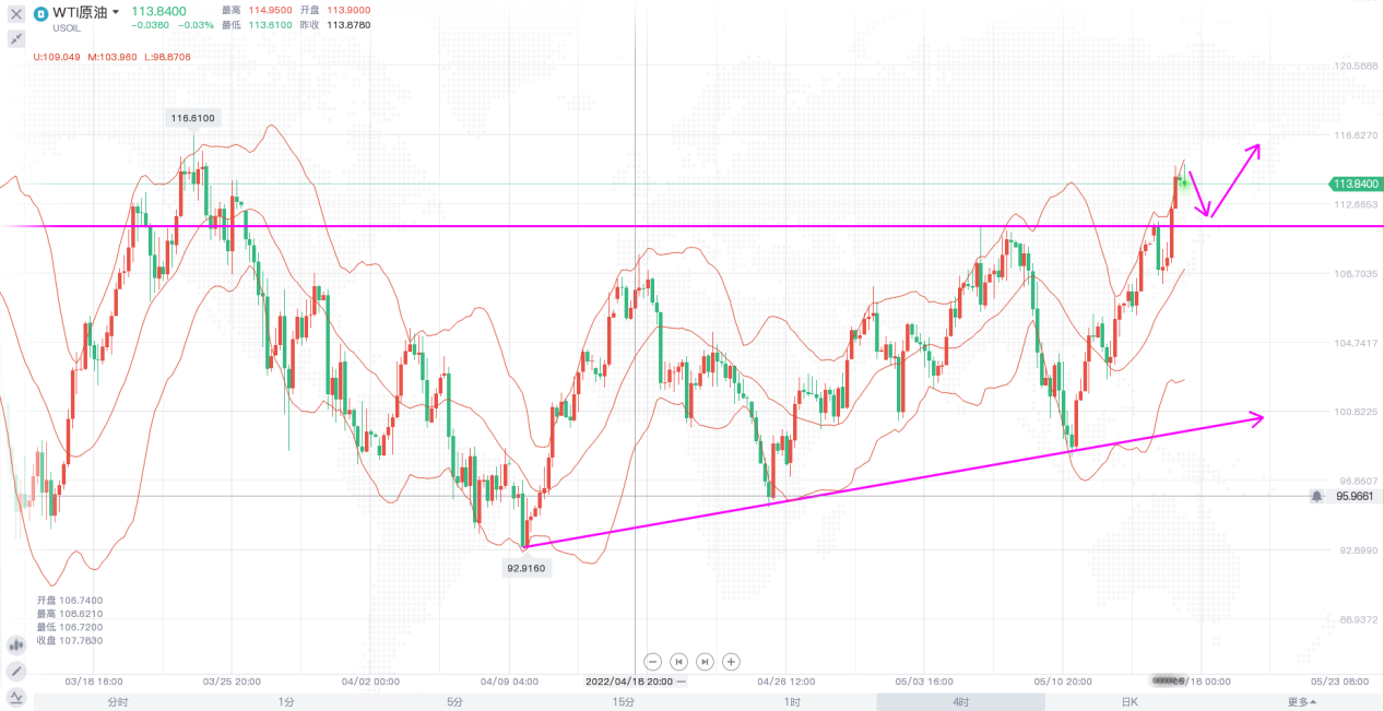 原油价格整体的强势已经很明显,地缘风险的不断蔓延,以及成品油市场的短缺,不断推动着油价上涨。日线级别,布林带开口向上,价格在经历了一段时间的高位震荡之后,再度开始向上反弹,昨日价格一度突破布林上轨的阻力,日内开盘,价格更是依托上轨的支撑再度向上试探,短线走势明朗,有望向116.5一线迈进。4小时,布林带开口向上,价格整体运行于上行通道之中,近几日基本没有太多的回调,走势相对强势,短线价格有望进一步走高,短线操作思路上回调做多即可,不过需要注意的是,价格大概率会回踩确认之后再上涨,而昨日开盘快速下跌的位置111.5一线阻力变支撑,就是很好的顶底转换位置,日内需重点关注此位置的支撑。