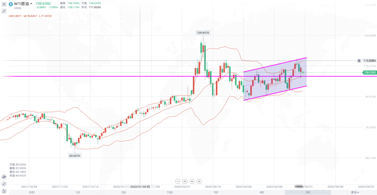整体来看,原油价格目前还处于上行通道之中,整体价格近段时间以来并没有太大的涨跌幅,基本处于震荡上行态势。日线级别,布林带开口向上,价格在触及上轨之后开始回落,昨日的一波反弹虽然收回一些失地,但早间开盘持续回落,短线来看,日内有回落的风险。4小时,布林带开口向下,价格在反弹至中轨附近后受阻开始回落,中轨附近阻力还是较为强劲,日内短线操作思路暂时先看回落,上方关注109.5一线阻力,下方关注106一线支撑。