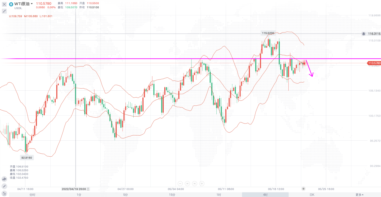 总体来看,俄永久禁止拜登入境,乌俄排除停火的可能性,使得地缘紧张局势升级;但周末猴痘病例的报道,且或已发生人际传播,加之引发担忧情绪,油价短线或受此消息影响进而回调。日线级别,布林带开口向上,价格整体处于上行通道之中,但近期向上的动力并不是很强,而上方111.5一线,价格多次触及并未能突破。4小时,布林带开口向下,价格受到中轨压制,目前横盘整理,日内操作思路先看一波回落,上方关注111.5一线的突破情况。