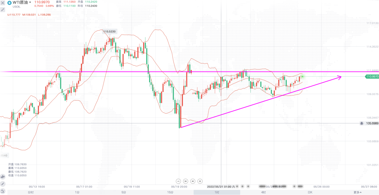 日线级别,布林带开口向上,价格运行于中轨和上轨之间,没有太过于明确的方向,短线继续保持着高位震荡的态势。4小时,布林带走平,价格多次向上试探111.5一线,均未能突破,早间开盘,价格站稳中轨再次向上发起冲击,日内需要关注此位置的破位情况,如若能够上破,后市大概率会向115美元一线靠近,日内操作思路回调做多,下方关注110.3一线支撑。