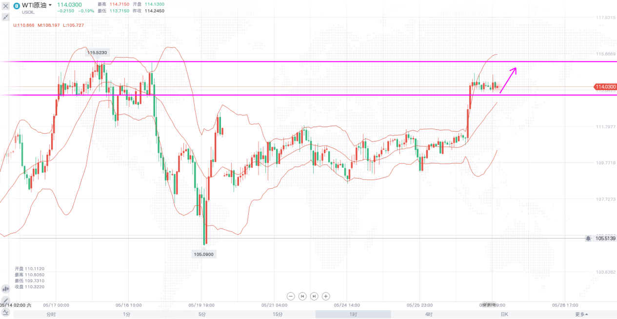 整体来看,原油价格的上涨趋势已经很明朗,短线维持看多基调。日线级别,布林带开口向上,价格在本周经历了三天的横盘整理之后,依托中轨支撑,开启了上涨模式,不过需要注意的是,上方116一线阻力较为强劲,前期价格多次触及到,都未能上破。4小时,布林带开口,一根大阳线突破上轨附近阻力,打开了上方空间,日内价格有望继续上涨,去试探116一线,短线操作思路回调做多,下方关注113.5一线支撑。