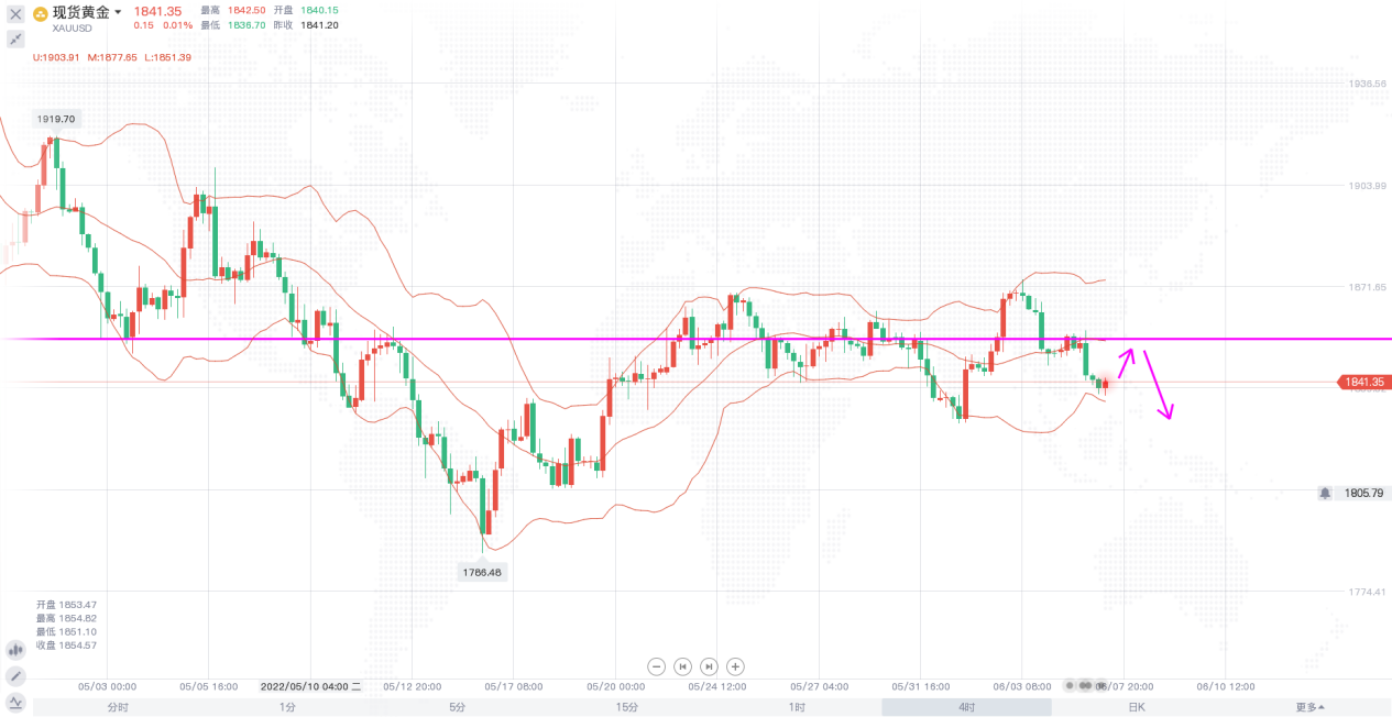 整体来看,原油强势的格局并没有改变,价格再度向前高发起冲击基本上是板上钉钉的事情,无非就是时间的问题。日线级别,昨日一波回调之后,布林带有收口迹象,但回调力度并不是很大,走势和之前一样,小幅回调之后再拉升,早间开盘的企稳上涨就是很明显的佐证。4小时,布林带开口向上,价格在回撤至中轨附近之后企稳反弹,短线方向比较明朗,日内操作思路很明确,就是回踩中轨附近做多,也就是118美元一线的支撑,这是日内需要重点关注的支撑位置,一旦价格突破昨日高点,那么就离前高不远了。