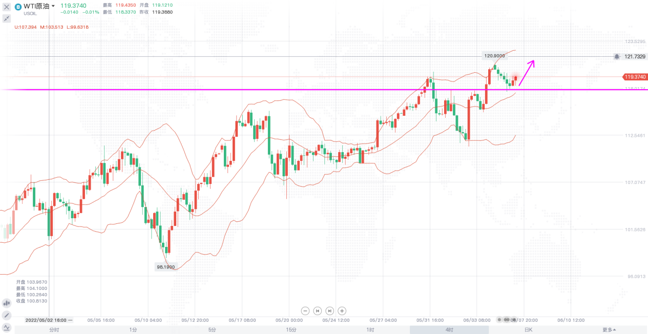 原油周一小幅回调走低,尽管沙特阿拉伯上调7月原油价格,但市场怀疑OPEC+产油国上调产量目标能否缓解供应紧张,并且印度寻求从俄原油公司增加俄油进口量,油价回落至120美元/桶下方;当然,从技术层面上来说,昨日也说过,上方120美元一线阻力强劲,价格会有一波回踩的行情,然后再去上攻。
