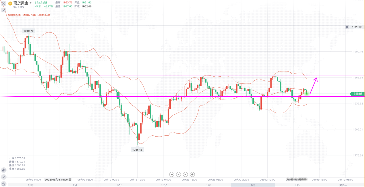 黄金方面,近两周时间基本是陷入震荡区间,没有明确的方向,价格始终横盘于1840-1870范围之内。日线级别,布林带收口走平,价格运行于上轨和中轨之间,布林中轨在下方形成一定的支撑,价格向上向下突破的力量较小,在没有破位之前,以区间震荡操作。4小时,布林带收口,价格自下轨反弹至中轨附近,很明显可以看出,在1840一线,价格多次触及,但很难做到有效突破,说明下方支撑较为强劲,日内操作思路上以1840一线为防守,回调做多即可。