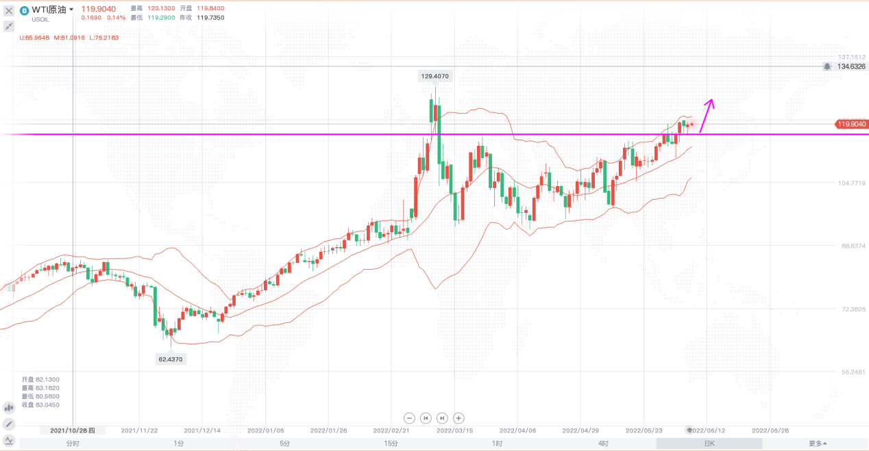 整体来看,原油依旧保持强势的态势,保持着震荡上行的节奏一步步迈向高点,不过上方120美元一线阻力较为强劲,本周价格多次试探,均未能作出突破。日线级别,布林带开口向上,价格在高位横盘震荡,下方118美元一线形成强有力的支撑,短线走势偏强。4小时,布林带开口向上,价格基本按照预期回撤至中轨附近企稳后开始反弹,日内短线操作思路继续以118-118.5一线为防守回调做多即可。