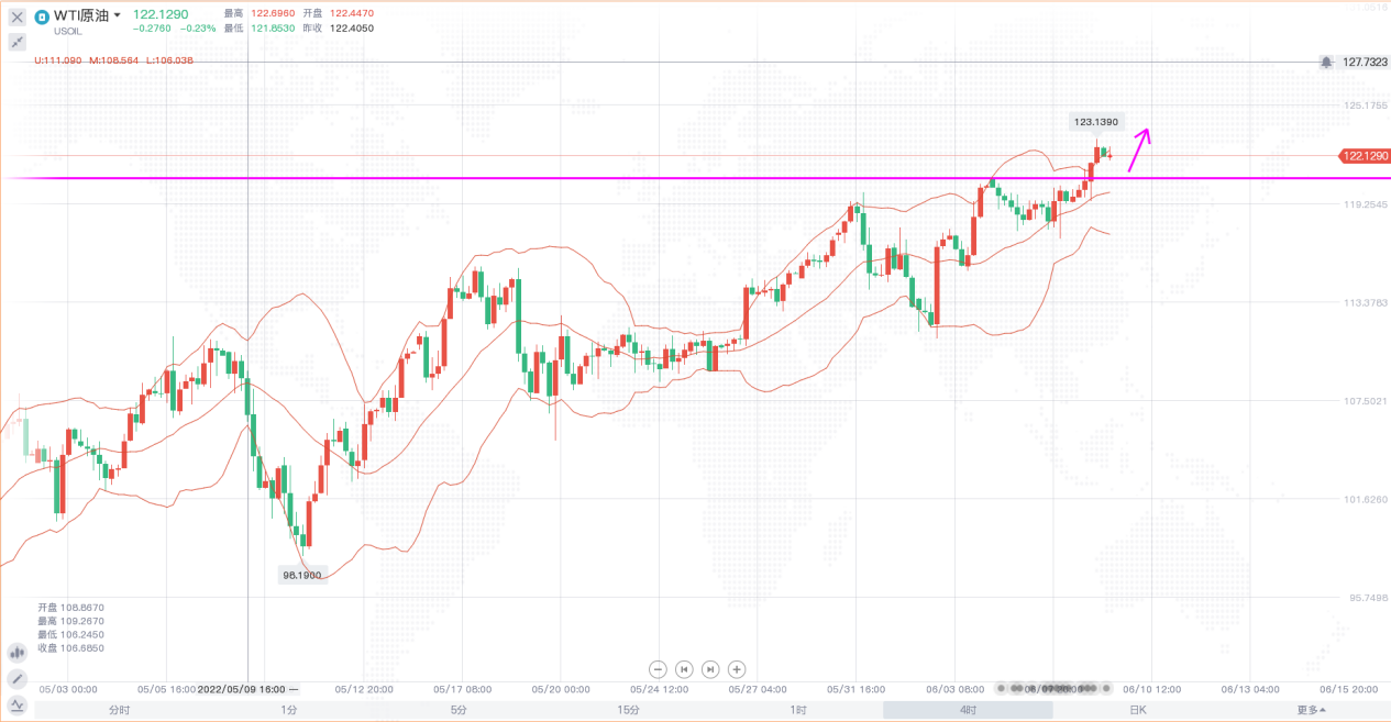 原油整体的强势已经毋庸置疑,价格在昨日站上120美元关口之后,基本上是奠定了价格要去刷新前高的基础。日线级别,布林带开口向上,价格沿着上轨震荡上行,低点不断上移,每次小幅回调的位置,就是多单进场的最好点位,整体方向明确。4小时,布林带开口,价格在持续受到中轨支撑后,再度拉升,短线有望继续走出新的高点,日内操作思路回调做多即可,下方关注120.9一线支撑。