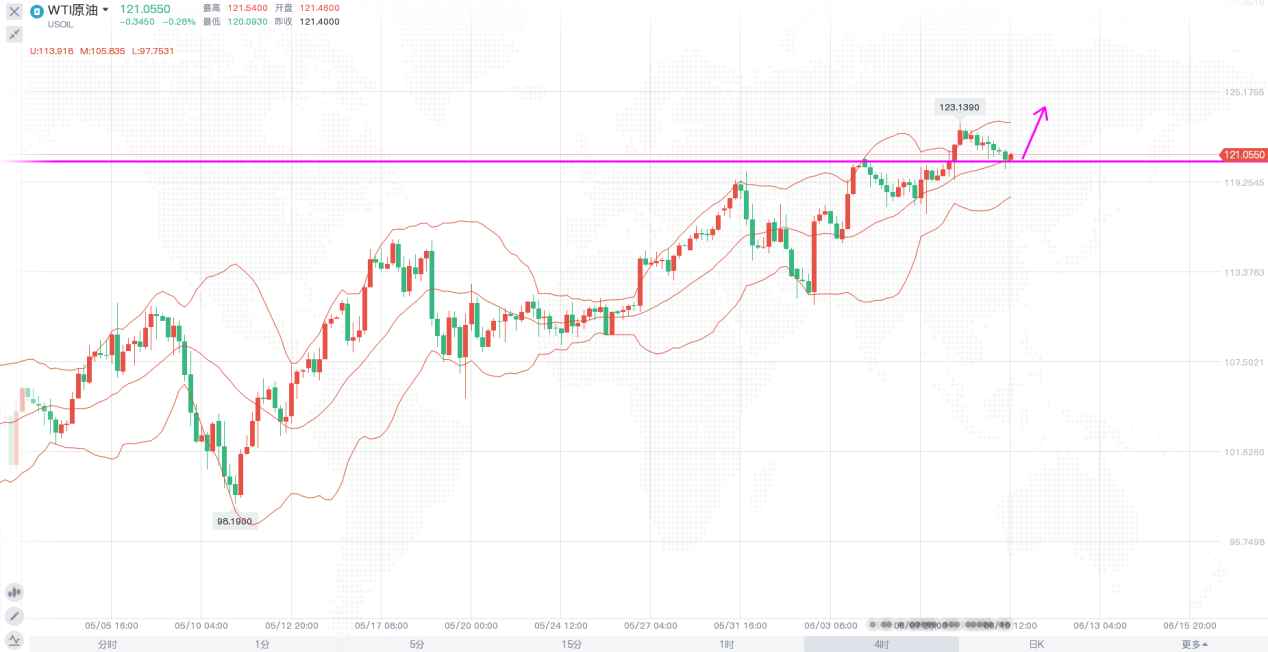 总而言之,原油市场的大环境推动着油价不断上行,虽然昨日迎来了一波回调,但只能算作是上涨过程中的调整而已,整体方向还是继续看涨。日线级别,布林带开口向上,价格在上轨附近遇阻回落,但并未跌破120美元这一顶底转换位置,所以短线以120美元为支撑看反弹。4小时,布林带开口,价格自高点回撤至中轨附近,目前暂时企稳,日内短线只要不跌破中轨,价格就有望继续延续涨势,下方关注120美元一线支撑。